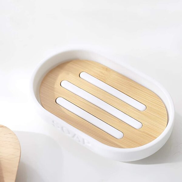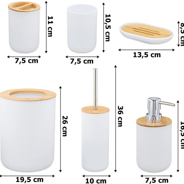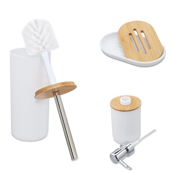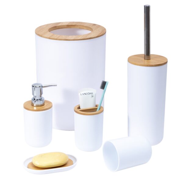 dozownik mydła, kubek na szczoteczki do zębów kosz na śmieci, kubek łazienkowy do płukania ust, mydelniczka, szczotka do WC, pojemnik na śmieci. Starannie wykonany, ma opływowe kształty, dzięki czemu nie tylko wpisuje się w najnowsze trendy wnętrzarskie i bardzo łatwo utrzymać go w czystości. Jasne, ozdobne elementy wykonano z naturalnego bambusa. Dzięki temu bardzo łatwo będzie znaleźć inne, pasujące dodatki w tym kolorze. Bambus jest obecnie bardzo popularnym i chętnie wybieranym materiałem przy urządzaniu nowoczesnych i modnych wnętrz. Sprawdzi się doskonale w stylu loftowym, nowoczesnym, klasycznym.