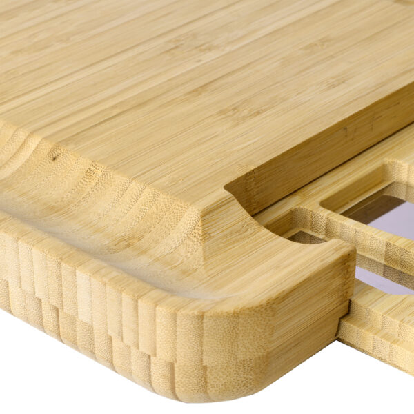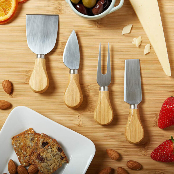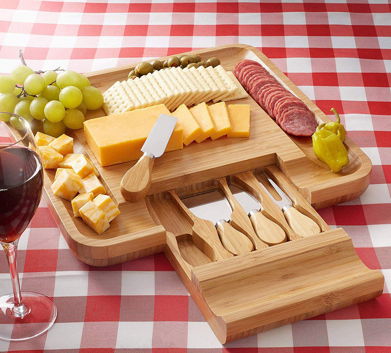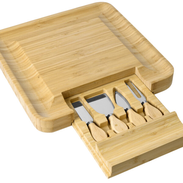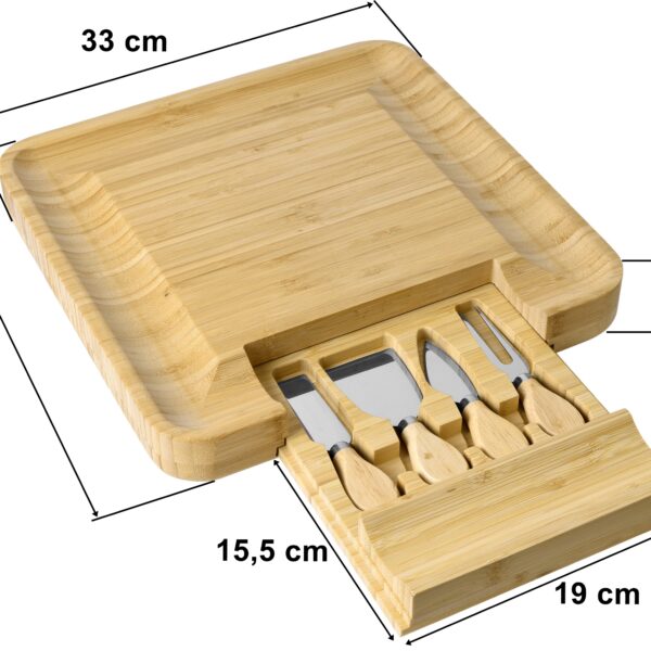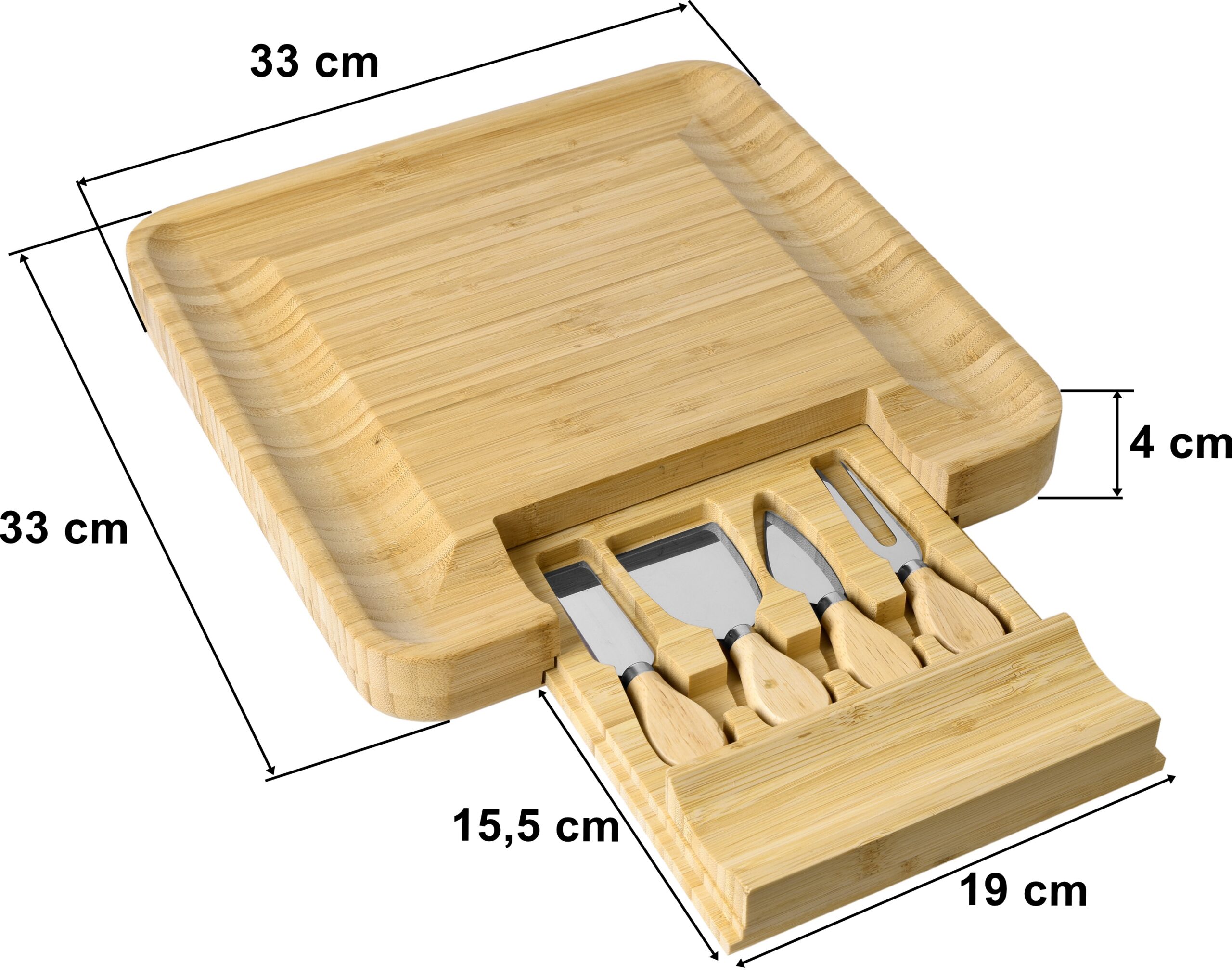 Wykonana ze 100% drewna bambusowego wysokiej jakości. Doskonały pomysł na prezent dla miłośników serów i nie tylko. Deska wyposażona w szufladkę, w której znajduje się komplet noży ze stali nierdzewnej. Wgłębienia na brzegach pozwalają na efektowne ułożenie przekąsek i dodatków. Dodatkowe akcesoria ułatwią nakładanie i krojenie przekąsek oraz utrzymanie porządku na stole. Deska świetnie sprawdzi się podczas każdej imprezy czy spotkań ze znajomymi. Będzie doskonałym dodatkiem prezentowym.