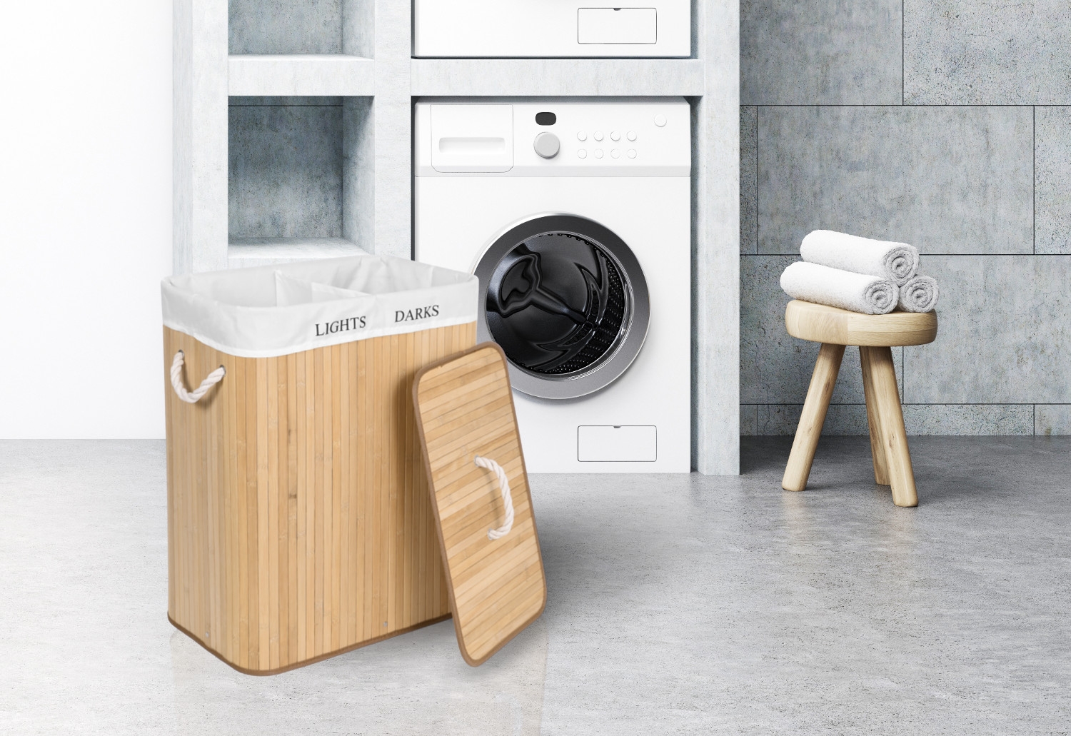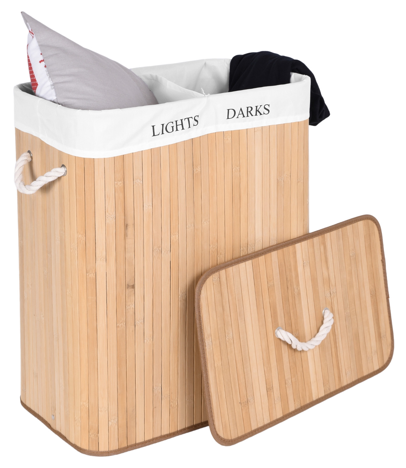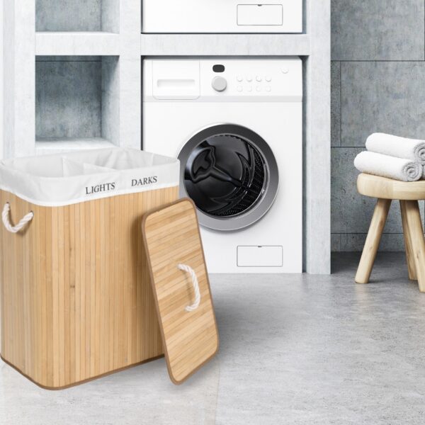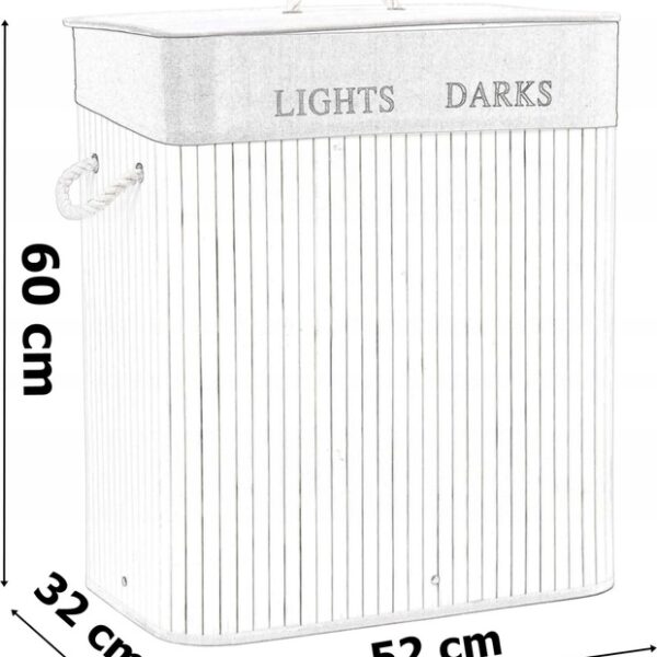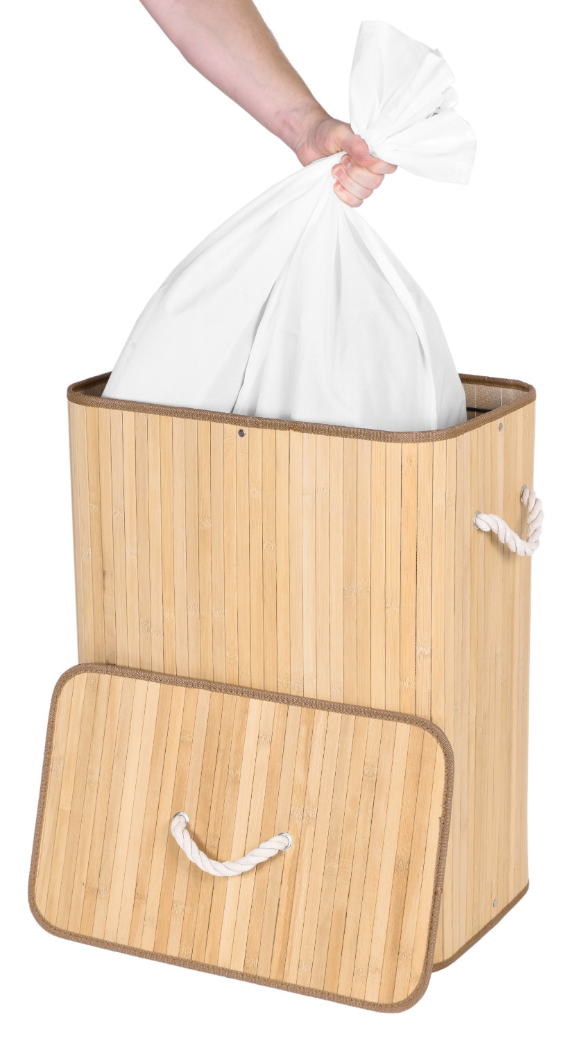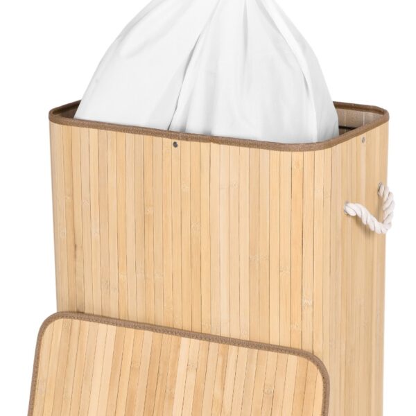 Najpiękniejszy i najtrwalszy, stylowy pojemnik na pranie o pojemności 100 litrów. Wykonany z naturalnego bambusa. Wnętrze wypełnia lniana torba z praktyczną przegrodą na jasne i ciemne pranie. Prosta, budowa, sztywna konstrukcja. Ukrywa nieprzyjemne zapachy. Umożliwia wygodne szybkie i pranie.