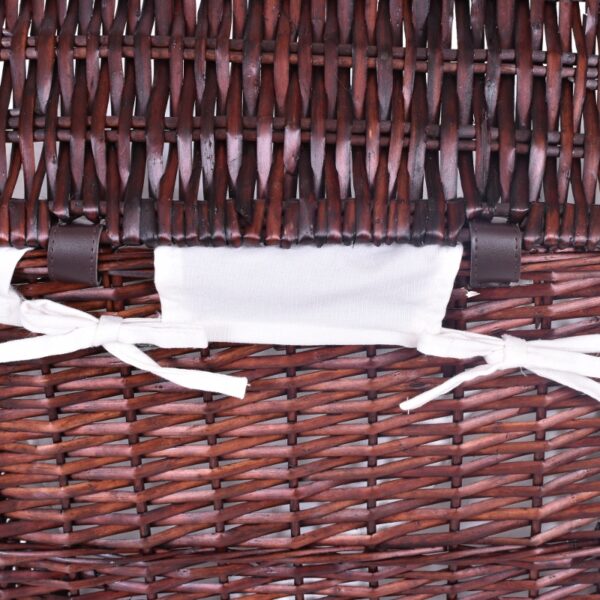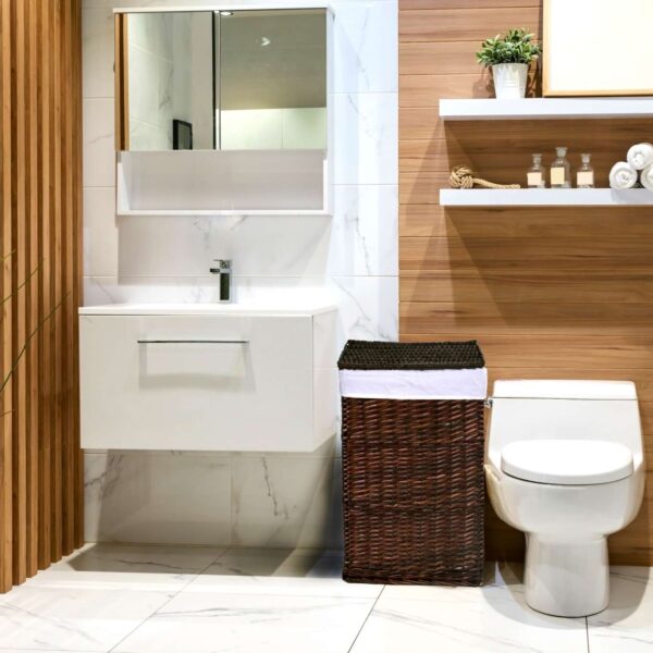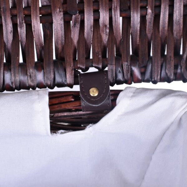 Kufer wiklinowy idealnie sprawdzi się w łazience oraz innych pomieszczeniach, typu sypialnia, salon, pokój dzienny. Jest on bardzo ładnym uzupełnieniem, które dodaje charakteru dekorowanym pomieszczeniom. Produkt jest estetycznie wykonany z wikliny, a w środku wykończony lnianą wyściółką. Pokrywa posiada elastyczne paski, służące jako zawiasy.