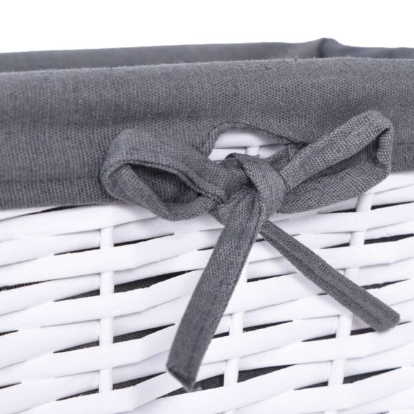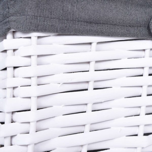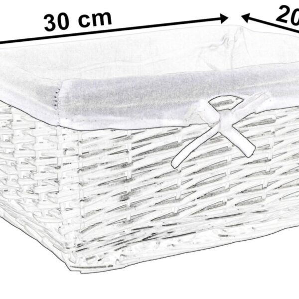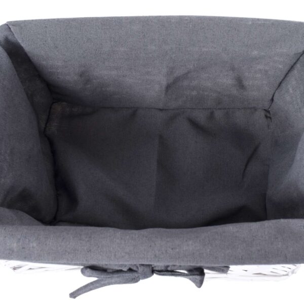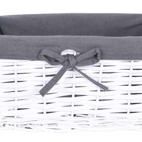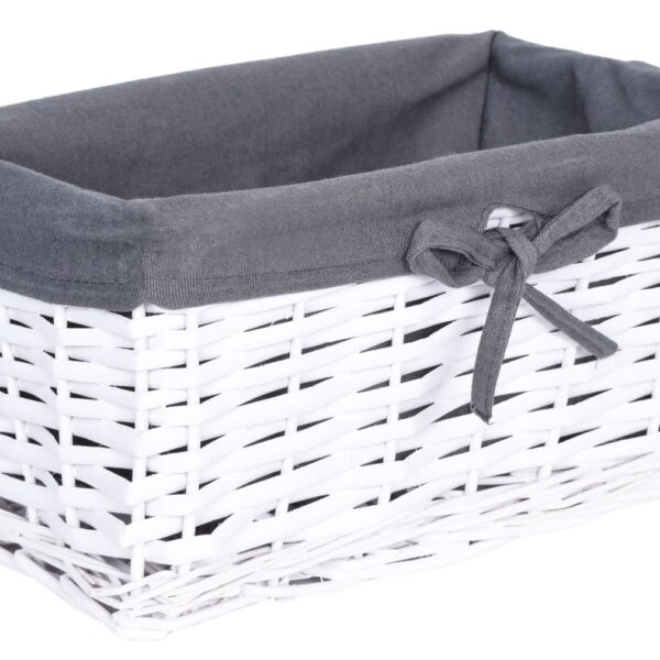 Koszyk wiklinowy starannie pomalowany na kolor biały, wyłożony szarym materiałem z domieszką lnu. Idealny do wnętrz w stylu rustykalnym oraz łazienki. Doskonały do przechowywania drobiazgów i kosmetyków.
