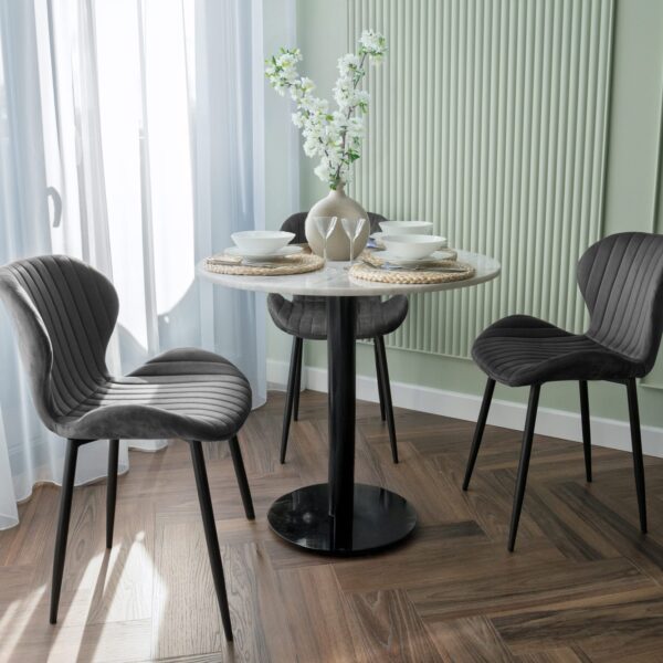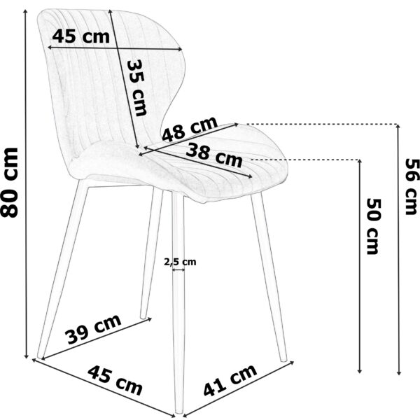 Wyjątkowe połączenie przyjemnego, aksamitnego materiału welurowego z metalowymi czarnymi nogami. Krzesło bardzo wygodne, stabilne, z profilowanym oparciem. Nie czekaj! Odśwież swoje pomieszczenie już teraz!