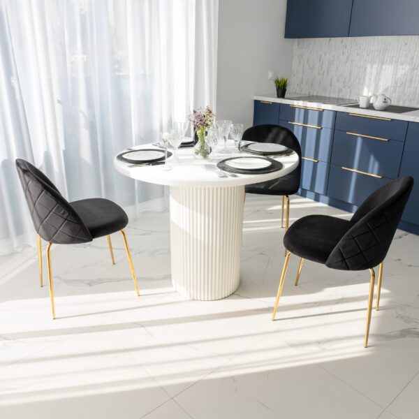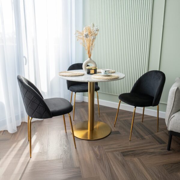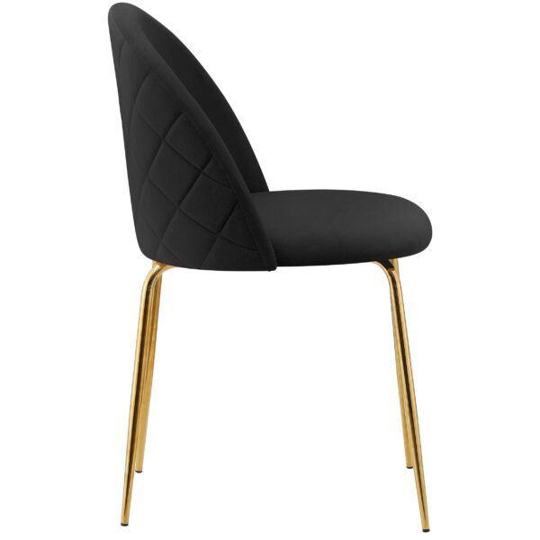 Krzesło Fargo łączy nowoczesny design, elegancję i wygodę. Welurowe obicie oraz metalowe nogi w złotym kolorze zapewniają luksusowy wygląd i trwałość. Geometryczne pikowania w romby dodają dekoracyjnego charakteru. Idealne do salonów, biur i restauracji, tworząc wnętrza w stylu glamour i nowoczesnym.
