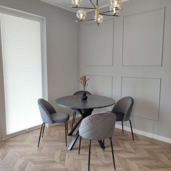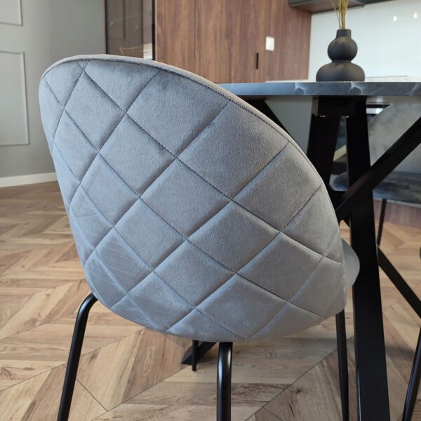 Unikalne krzesło Fargo wyróżnia się nowoczesnym designem i nietuzinkowym połączeniem miękkiego weluru oraz metalowych nóg. Wykonane z najwyższej jakości materiałów, z dbałością o każdy detal, z pewnością przyciągnie uwagę swoim geometrycznym, pikowanym wzorem w kształcie rombów. Krzesło Fargo to nie tylko designerski element dekoracyjny, ale także bardzo wygodne meble, idealne do nowoczesnych wnętrz w stylu loftowym i nowoczesnym. Doskonale sprawdzi się w salonach, restauracjach, ekskluzywnych sklepach, salonach kosmetycznych/fryzjerskich, eleganckich biurach czy punktach informacyjnych. Połączenie weluru i metalowych nóg doda pomieszczeniu nutę elegancji i niepowtarzalnego charakteru.