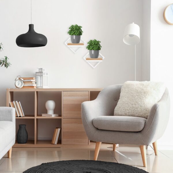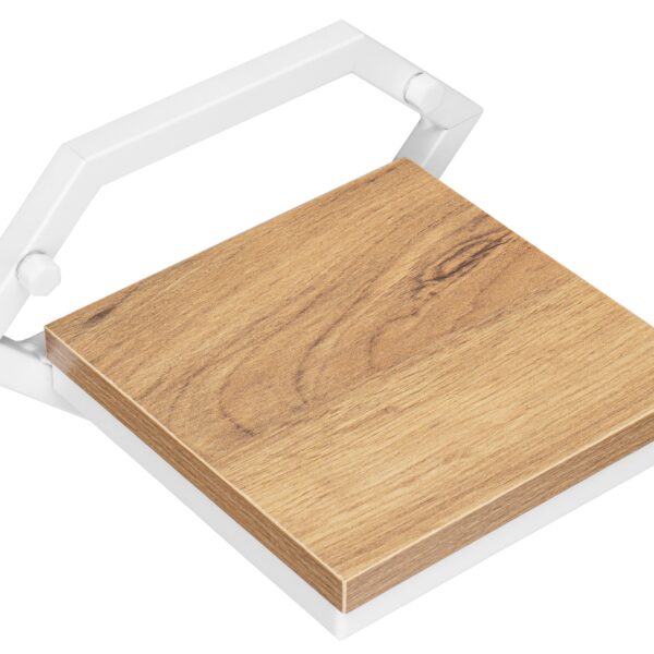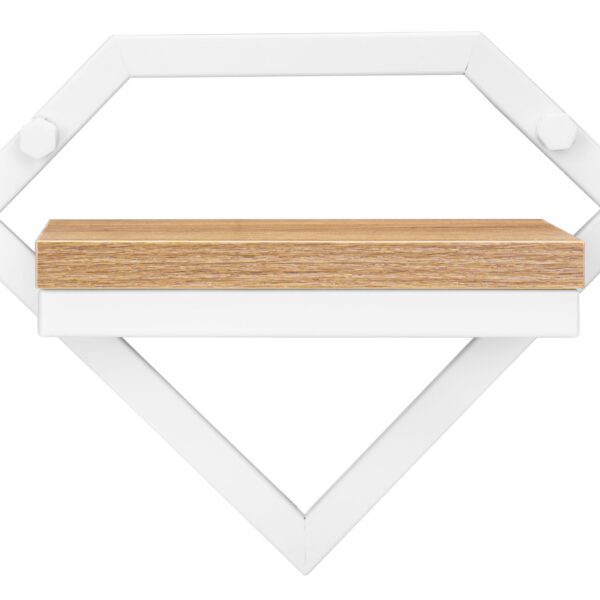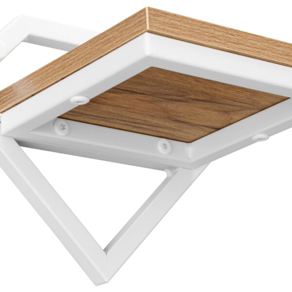 Półka z płyty laminowanej w kolorze dąb craft dodaje naturalnego akcentu, który świetnie kontrastuje z białą, metalową konstrukcją.