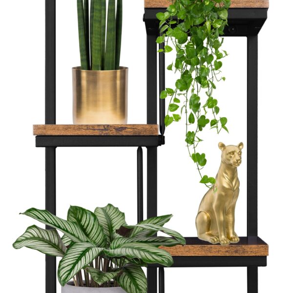 Polecamy solidny kwietnik ze stali malowanej proszkowo – Hagart. To najnowszy trend wnętrzarski o prostym kroju. Idealny do wnętrz loftowych, rustykalnych oraz urban jungle. Hagart cechuje estetyczne wykonanie. Posiada cztery półki laminowane w kolorze postarzanego dębu. Jego udźwig to aż 20kg, więc nie musisz martwić się, że coś się stanie z Twoimi roślinami czy ozdobami. W zestawie znajdują się kołki montażowe i instrukcja, dzięki czemu szybko uporasz się z montażem.