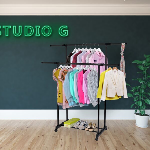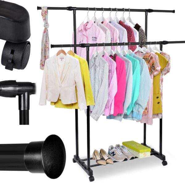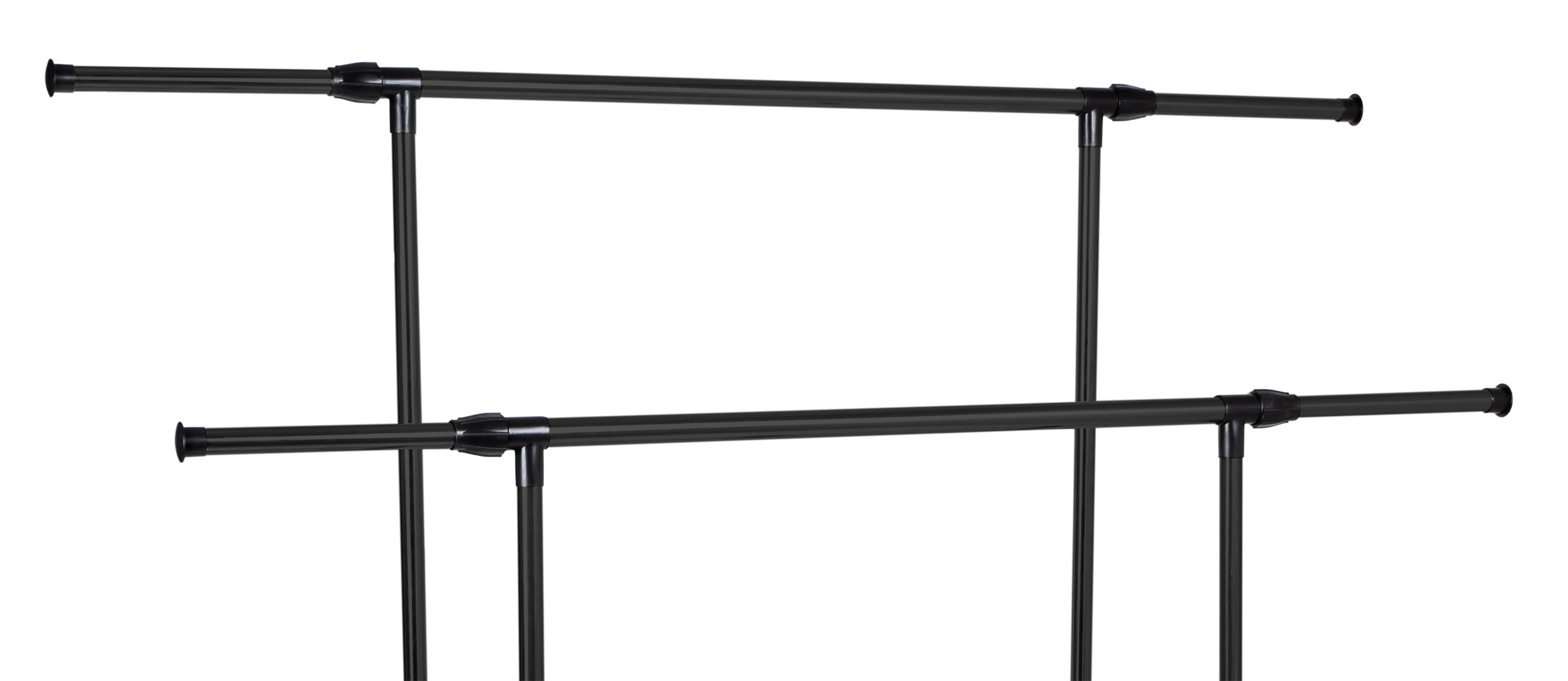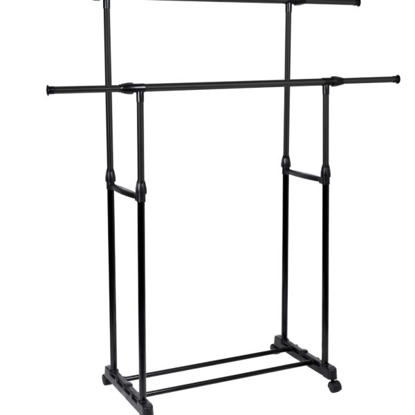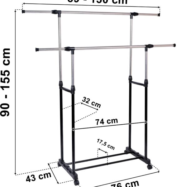 Z pomocą przychodzi mobilny wieszak Dara. Posiada dwie poprzeczki, dzięki czemu pomieści jeszcze więcej odzieży. Dodatkowo można je rozsuwać w razie potrzeby, a także regulować ich wysokość. Ważnym atutem są nakładki na drążki, dzięki którym wieszaki pozostaną na swoim miejscu. Warto zwrócić uwagę także na łatwe w montażu kółka z hamulcem, co pozwala na łatwe przesuwanie i „parkowanie” wieszaka dokładnie tam, gdzie chcemy. W dolnej części wieszaka Dara znajdują się dodatkowo dwie poprzeczki, które mogą posłużyć jako dodatkowa półka na obuwie.