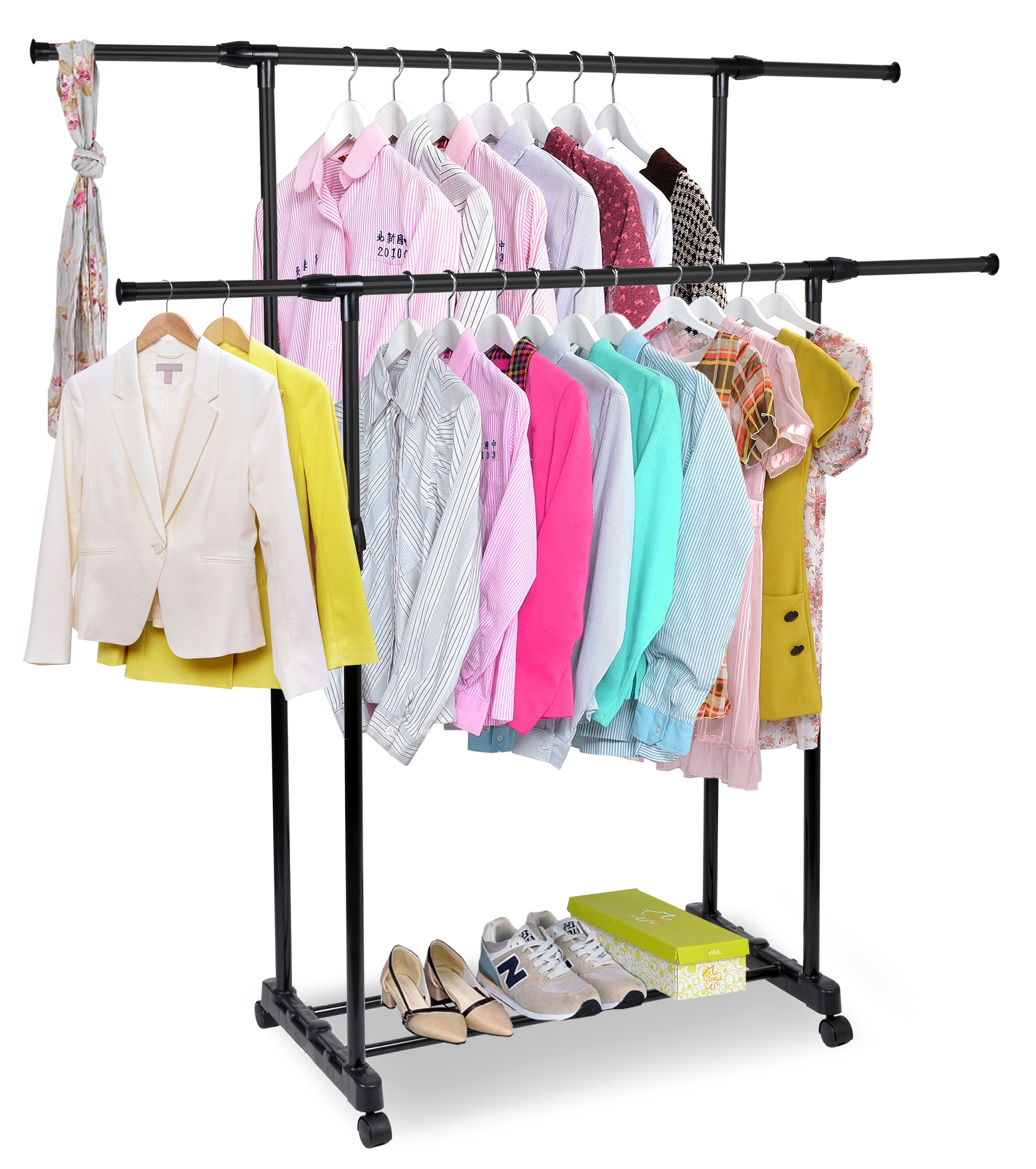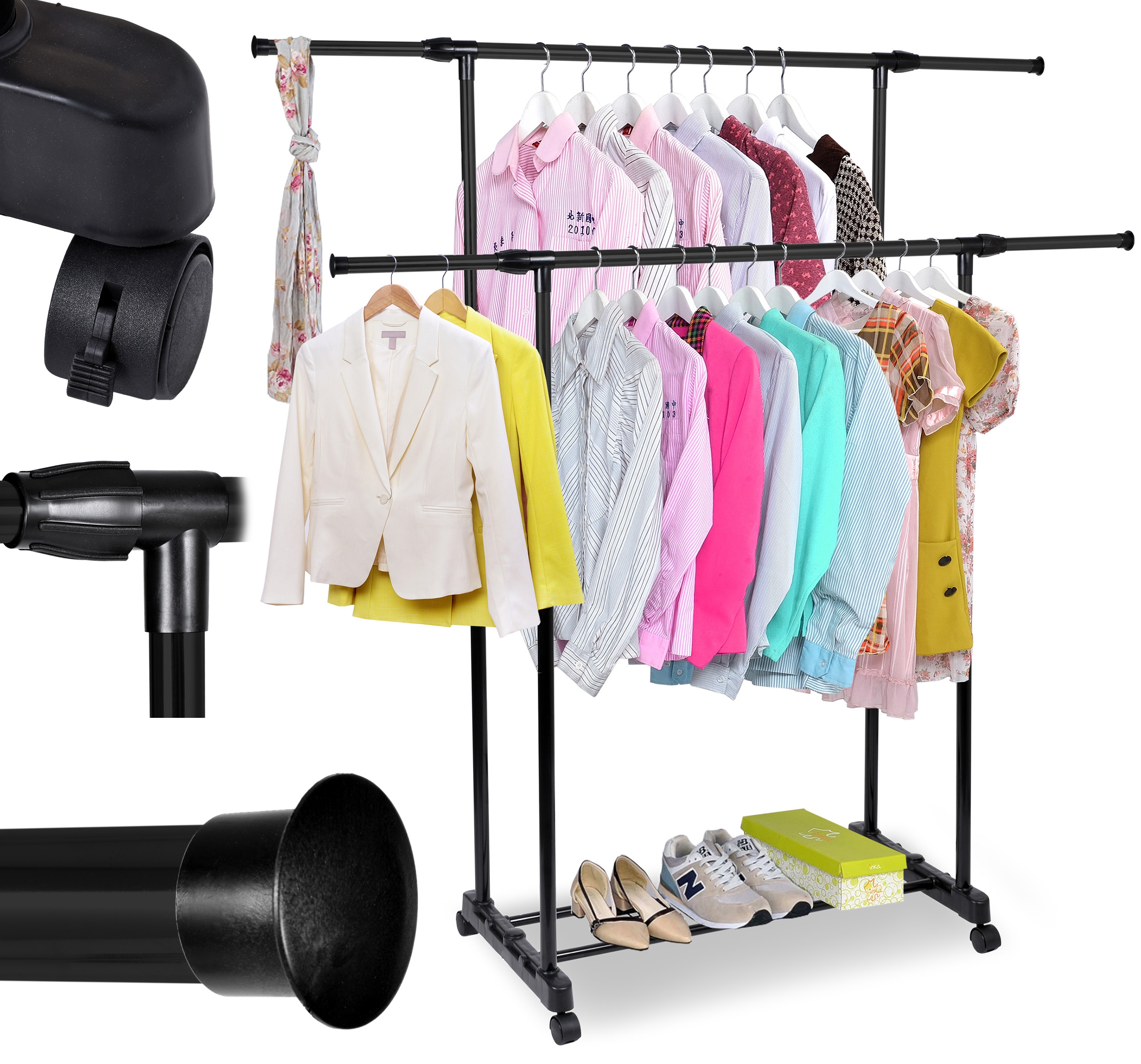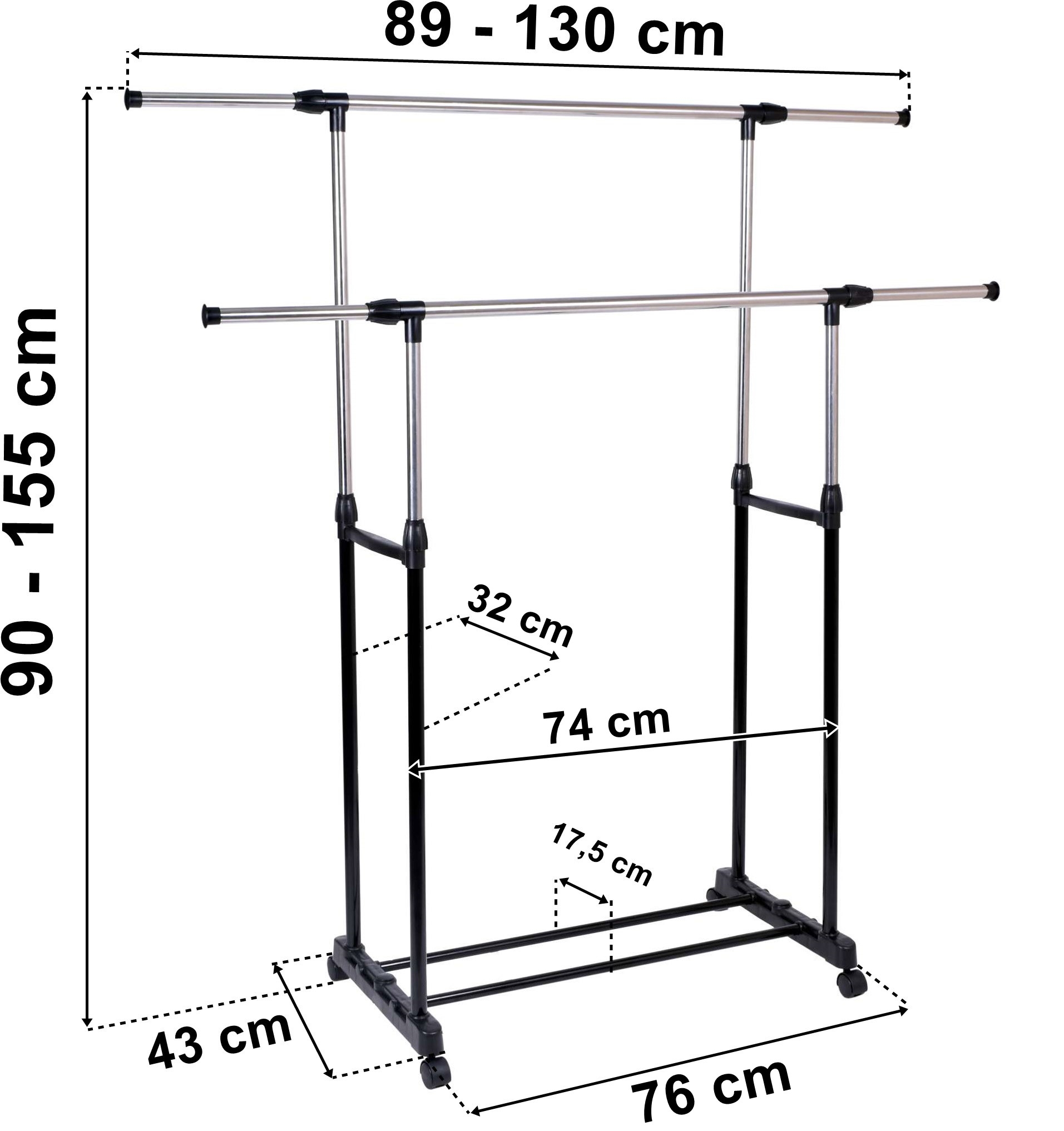 Z pomocą przychodzi mobilny wieszak Dara. Posiada dwie poprzeczki, dzięki czemu pomieści jeszcze więcej odzieży. Dodatkowo można je rozsuwać w razie potrzeby, a także regulować ich wysokość. Ważnym atutem są nakładki na drążki, dzięki którym wieszaki pozostaną na swoim miejscu. Warto zwrócić uwagę także na łatwe w montażu kółka z hamulcem, co pozwala na łatwe przesuwanie i „parkowanie” wieszaka dokładnie tam, gdzie chcemy. W dolnej części wieszaka Dara znajdują się dodatkowo dwie poprzeczki, które mogą posłużyć jako dodatkowa półka na obuwie.