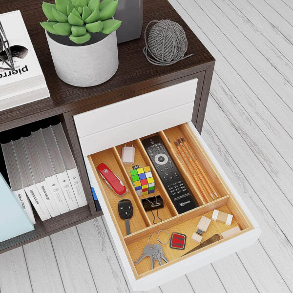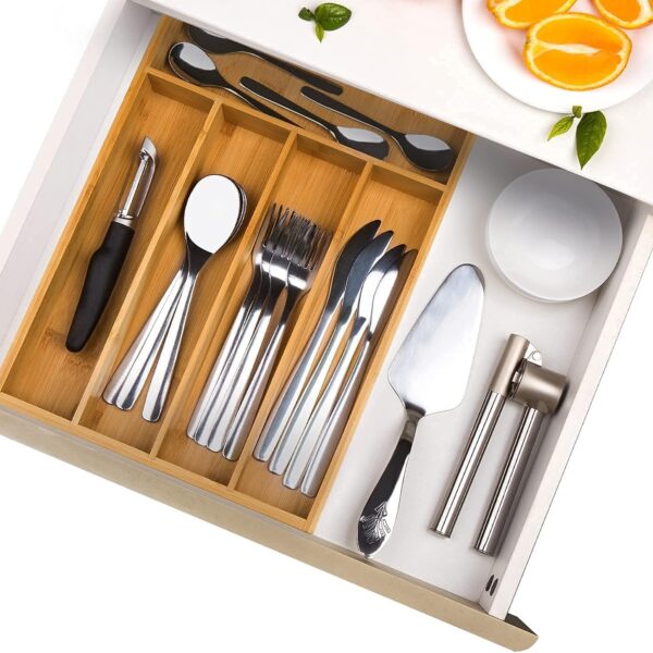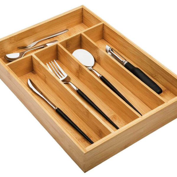 Wymiary: 25 x 35 cm sprawiają, że pasuje do większości szuflad, oferując 5 przegródek na sztućce i inne przedmioty. To nie tylko miejsce na sztućce, ale także wszechstronny organizer do przechowywania akcesoriów czy kosmetyków w kuchni, biurze czy łazience.