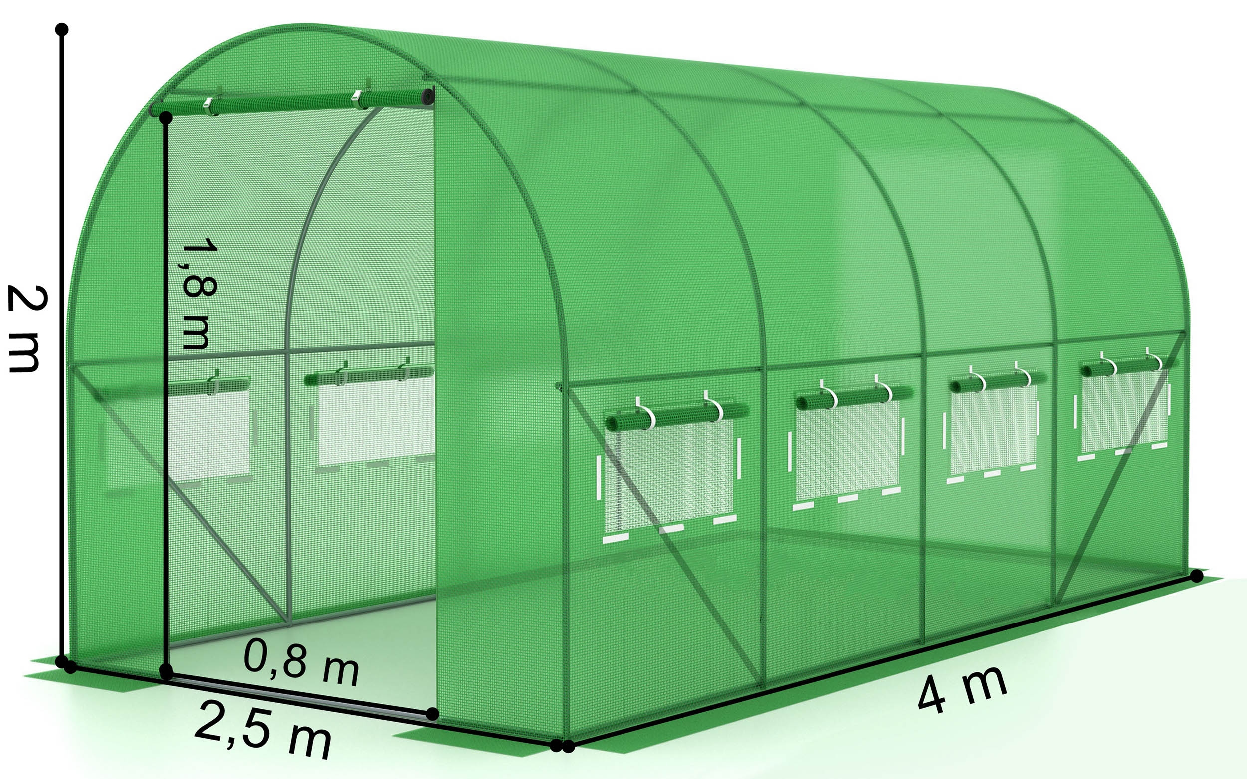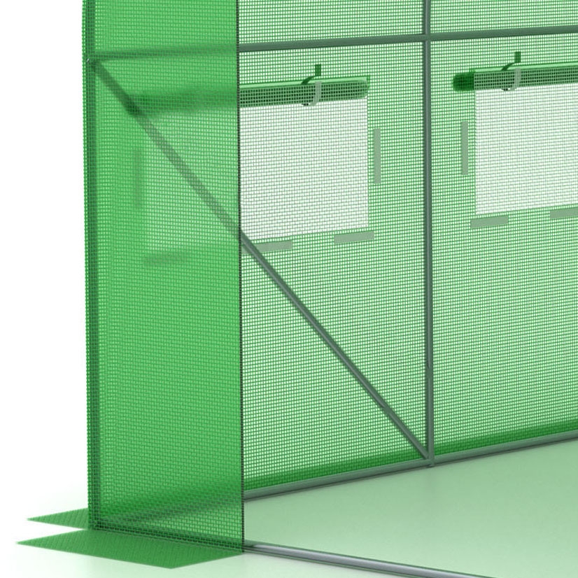 Dzięki siatce wtopionej w folię, powłoka jest odporna na rozerwania. Uszkodzenie folii nie powoduje jej dalszego rozrywania. Tunel wyposażony został w zamykane okna z moskitierą na bocznych ściankach. Okna pozwalają na przepływ powietrza oraz uzyskanie odpowiedniej wilgotności wewnątrz. Fartuch ziemny na bocznych brzegach folii można obsypać ziemią lub obciążyć kamieniami. Tunel dzięki temu zyska dodatkową stabilność, a także będzie chroniony przed podwianiem folii. Model posiada dodatkowe odciągi, które pozwalają na lepsze naprężenie pokrycia tunelu. Rolowane drzwi otwierane są za pomocą solidnych zamków błyskawicznych.