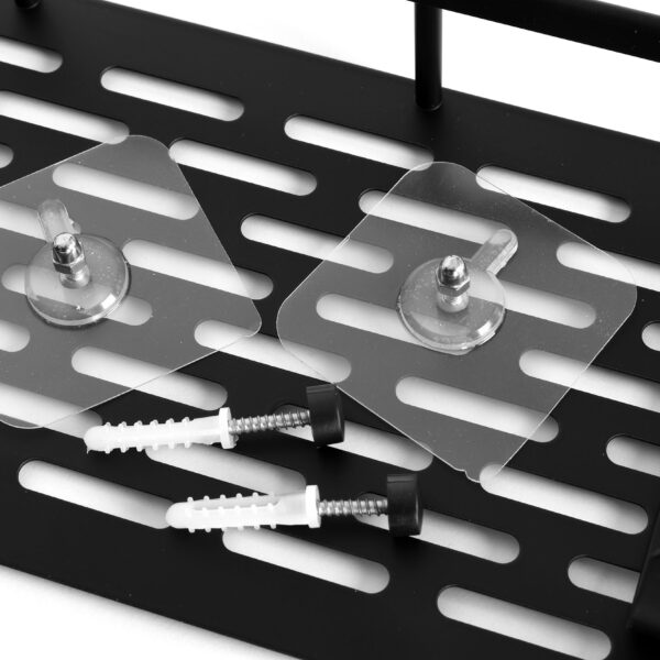 W zestawie: półka, dwa haczyki, dwie naklejki z klejem, dwa kołki montażowe, zaślepki, instrukcja