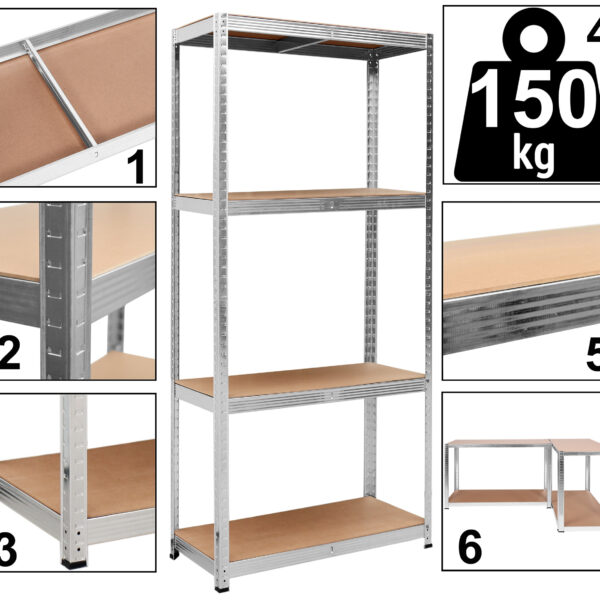 Regał magazynowy 150 kg 4 poziomy to doskonałe rozwiązanie do organizacji przestrzeni w piwnicy, garażu, warsztacie czy sklepie. Solidna konstrukcja ze stali i płyt MDF zapewnia stabilność i trwałość, nawet przy maksymalnym obciążeniu 600 kg. Dzięki szybkiemu i bezproblemowemu montażowi bezśrubowemu, na wcisk oszczędzasz czas i energię, a możliwość regulacji wysokości półek pozwala na pełne dopasowanie do Twoich potrzeb.