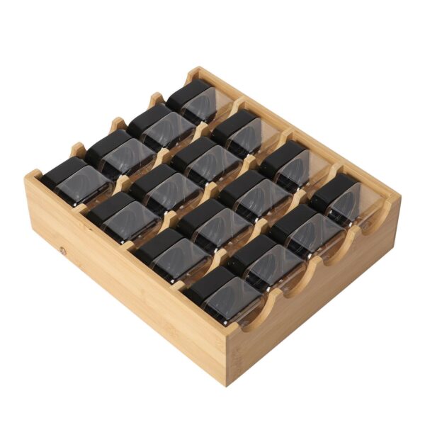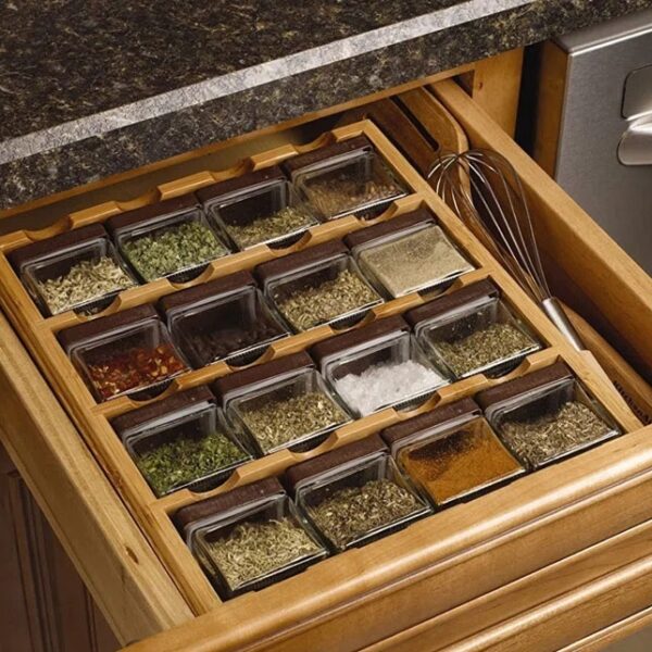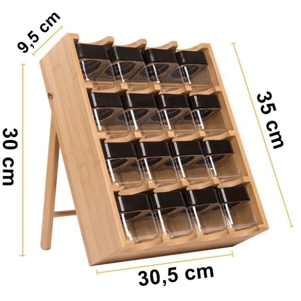 Każdy z 16 pojemników został zaprojektowany z myślą o wygodzie użytkowania, z łatwym dostępem, co pozwala szybko znaleźć potrzebną przyprawę podczas gotowania. Precyzyjne wykonanie stojaka gwarantuje, że jest on stabilny i bezpieczny w użyciu, zarówno kiedy stoi na blacie kuchennym, jak i gdy jest schowany w szufladzie. Jego kompaktowe wymiary sprawiają, że bez problemu zmieści się w większości kuchennych szafek, jednocześnie oferując wystarczająco dużo miejsca na wszystkie potrzebne przyprawy.