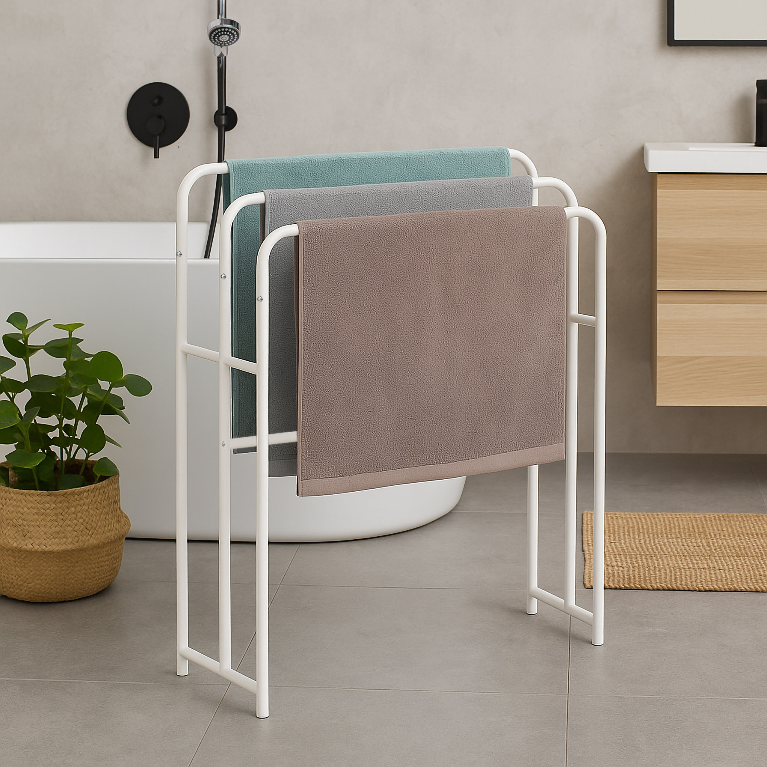 Stojak na ręczniki Rato to idealne rozwiązanie do Twojej łazienki. Wykonany z wysokiej jakości stali o białym wykończeniu prezentuje się nowocześnie i minimalistycznie, doskonale wpisując się w trendy aranżacyjne.