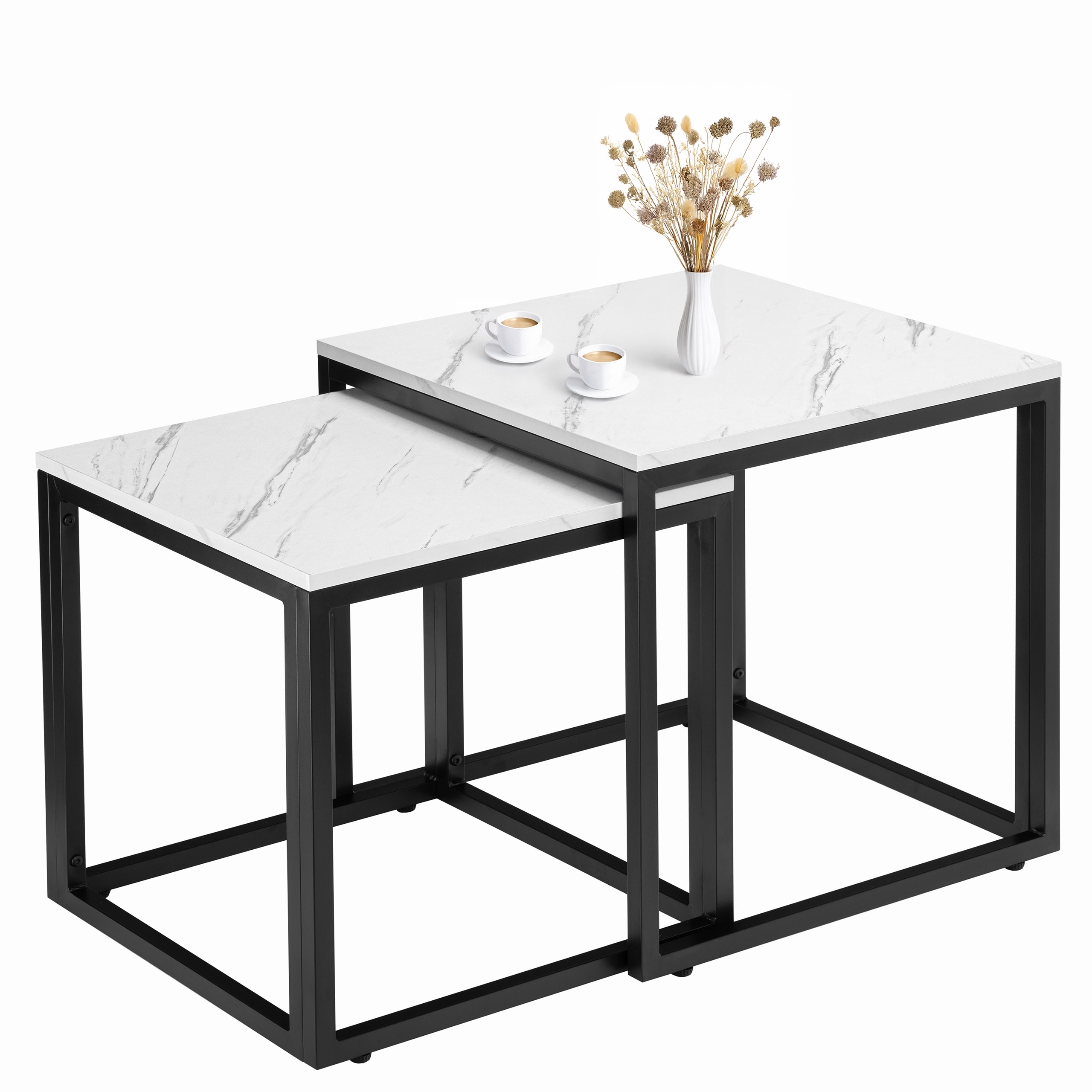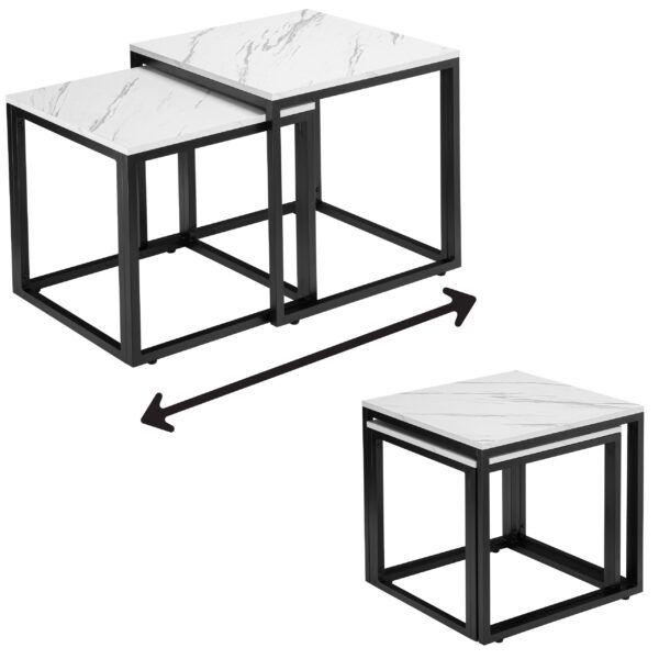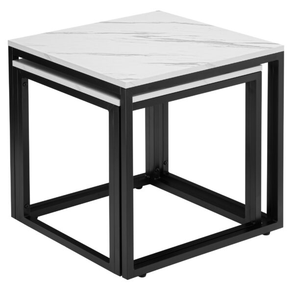 Zestaw stolików Praven to połączenie elegancji i funkcjonalności, które odmieni Twoje wnętrze. Idealnie sprawdzą się w salonie, biurze czy pokoju gościnnym, oferując praktyczne rozwiązanie w stylowym wydaniu. Możesz ustawić je razem, tworząc dynamiczną aranżację, lub osobno – w zależności od potrzeb. Regulowane nóżki zapewniają stabilność nawet na nierównych powierzchniach, a solidna metalowa konstrukcja gwarantuje trwałość na lata. Zastosowanie laminowanego blatu o wyglądzie marmuru sprawia, że stoliki są eleganckie i łatwe w utrzymaniu czystości. Dodatkowym atutem jest możliwość wsunięcia mniejszego stolika pod większy, co pozwala zaoszczędzić miejsce, gdy nie są w użyciu.