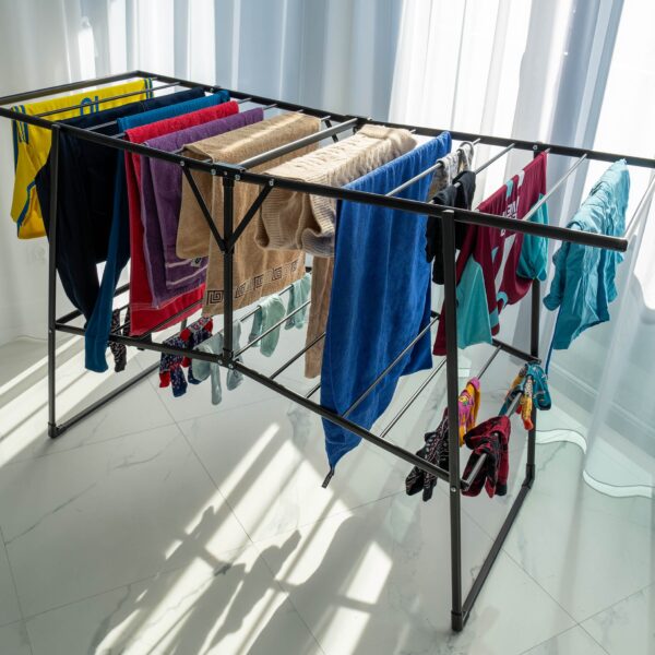 Stabilna konstrukcja pozwala na bezpieczne suszenie większych ilości prania, w tym cięższych ubrań jak kurtki, ręczniki czy koce.