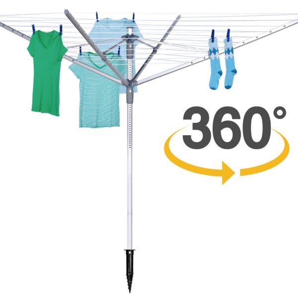 Suszarka zawiera innowacyjny system obrotowy 360°, który umożliwia szybkie rozkładanie i zbieranie prania bez potrzeby przemieszczania się wokół. Regulacja wysokości linek pozwala także na dopasowanie suszarki do indywidualnych preferencji, co podnosi ergonomię użytkowania.