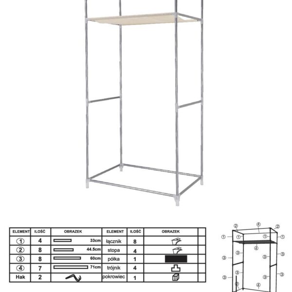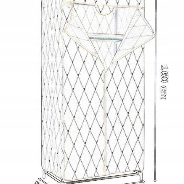 Szafa wykonana ze stalowych ramek tworzących jej szkielet. Na stelaż nałożony jest oddychający dobrej jakości materiał wraz z nadrukowanym widokiem. Jest łatwa do utrzymania czystości i praktyczna, półka idealnie nadaje się do przetrzymywania czapek, szalików, rękawiczek lub innych drobnych rzeczy. W głównej części szafy jest także możliwość zawieszenia ubrań na wieszakach. Lekka i solidna konstrukcja w dowolnej chwili możesz ją złożyć, przewieść, przestawić.