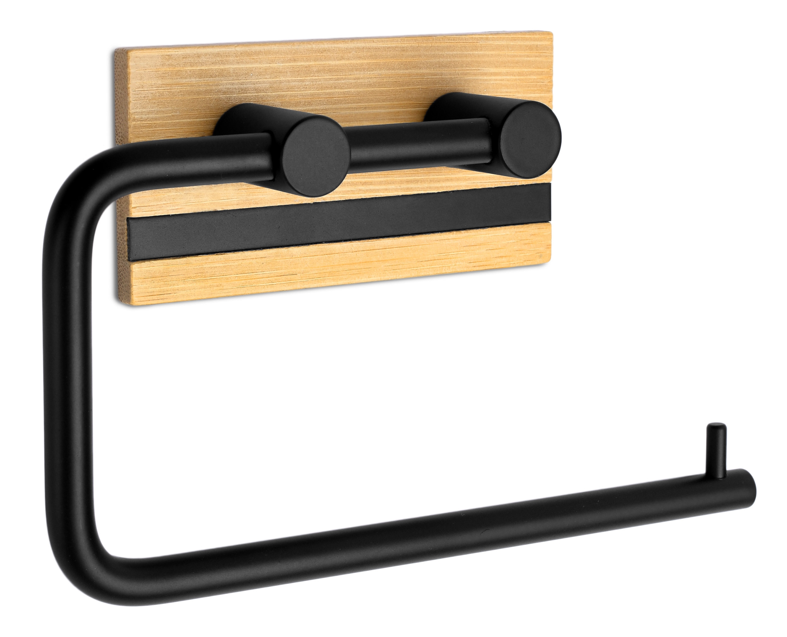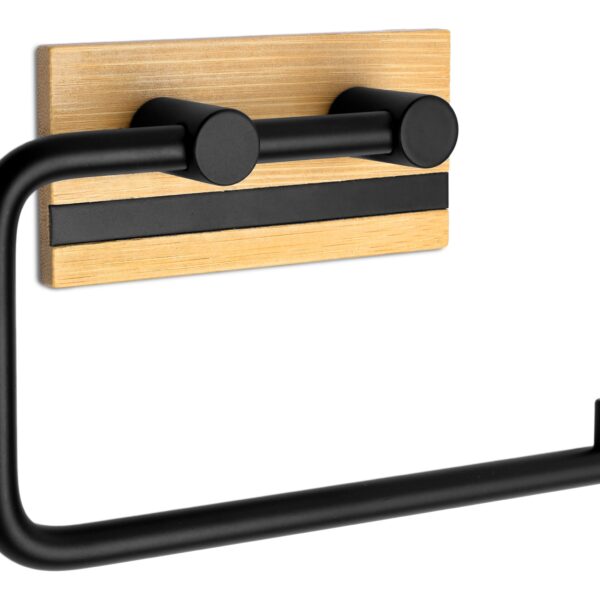 Uchwyt na papier toaletowy Demak został wykonany ze stali nierdzewnej malowanej proszkowo i z naturalnego drewna bambusowego. Uchwyt o nowoczesnym wyglądzie i wykończony na kolor głębokiej, matowej czerni. Czarny kolor sprawia, że doskonale sprawdzi się w każdej łazience. Idealnie pasuje do stylu loftowego. Uchwyt cechuje ciekawe połączenie materiałów oraz estetyczne wykonanie. Model ma gładkie i zaokrąglone krawędzie i perfekcyjnie wkomponuje się w nowocześnie urządzone wnętrza.