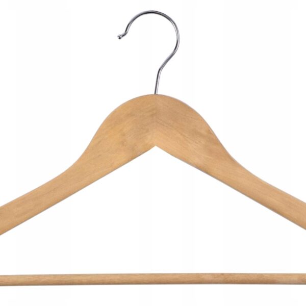 Wieszak Rondo wykonano z wysokiej jakości drewna. Został starannie wykończony i zabezpieczony farbą, dzięki czemu będzie doskonale prezentował się także w eleganckich butikach z luksusową odzieżą. W domowym zaciszu zadba o to, by Twoje ubrania nie zsuwały się, posiada bowiem specjalne wcięcia na ramionach. Dodatkowa poprzeczka pozwoli zawiesić dodatkowe elementy garderoby i zapobiegnie ich zagnieceniu. Hak wieszaka wykonano ze stali nierdzewnej, co znacząco wyróżnia go pod względem trwałości na tle konkurencji.