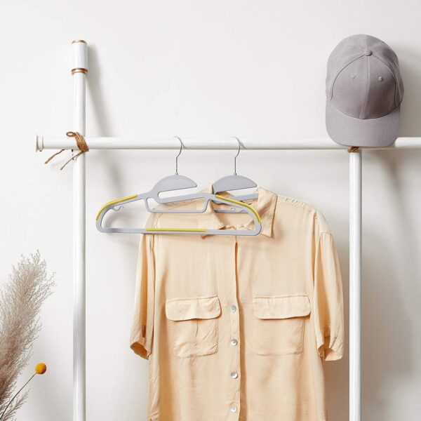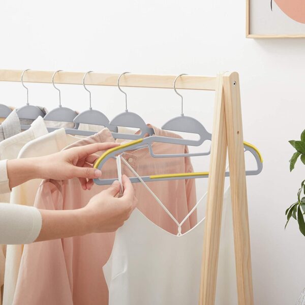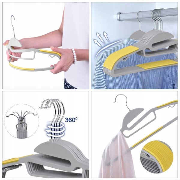 Oferujemy elastyczne i mocne wieszaki plastikowe idealne do szafy, garderoby czy też ekspozycji odzieży w butiku. Wieszaki wykonano z mocnego i wytrzymałego tworzywa sztucznego. Żółte, gumowe elementy zapobiegają zsuwaniu się ubrań, a odpowiednie wyprofilowanie sprawia, że tkaniny nie ulegają deformacji. Wieszaki posiadają metalowy, chromowany haczyk. Wieszak posiada wcięcia ułatwiające zakładanie odzieży. Dzięki temu odzież się nie rozciąga i nie deformuje.