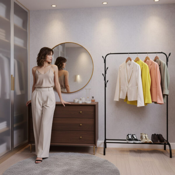 Szukasz funkcjonalnego, stabilnego i estetycznego miejsca na przechowywanie odzieży, butów i dodatków? Wieszak stojący Feliks czarny to nowoczesne i przemyślane rozwiązanie, które pomoże Ci zapanować nad chaosem w przedpokoju, garderobie czy sypialni. Zmieści zarówno codzienną garderobę, jak i sezonowe dodatki, dzięki czemu zyskasz więcej przestrzeni i porządek. Blokady zapobiegające zsuwaniu się ubrań, aż 8 bocznych haczyków oraz pojemna półka na buty to tylko niektóre z jego atutów – a wszystko to w minimalistycznej, stylowej formie, która wpasuje się w każde wnętrze.