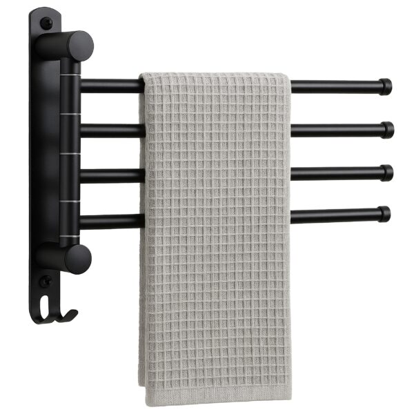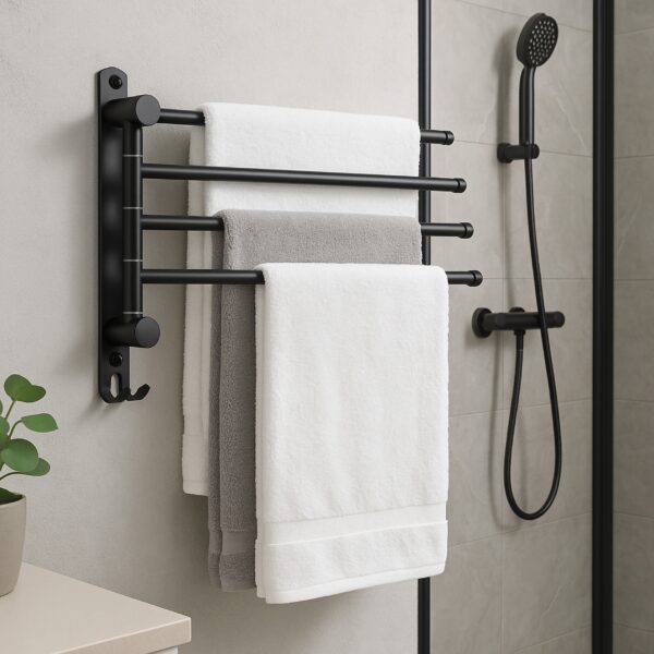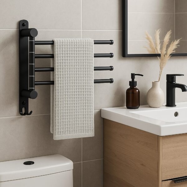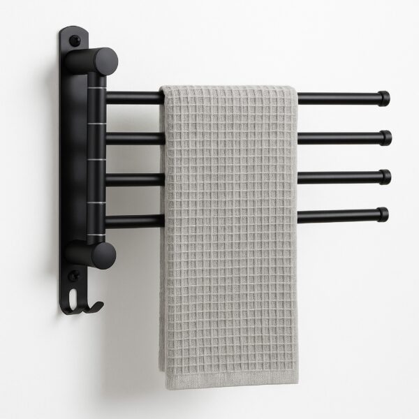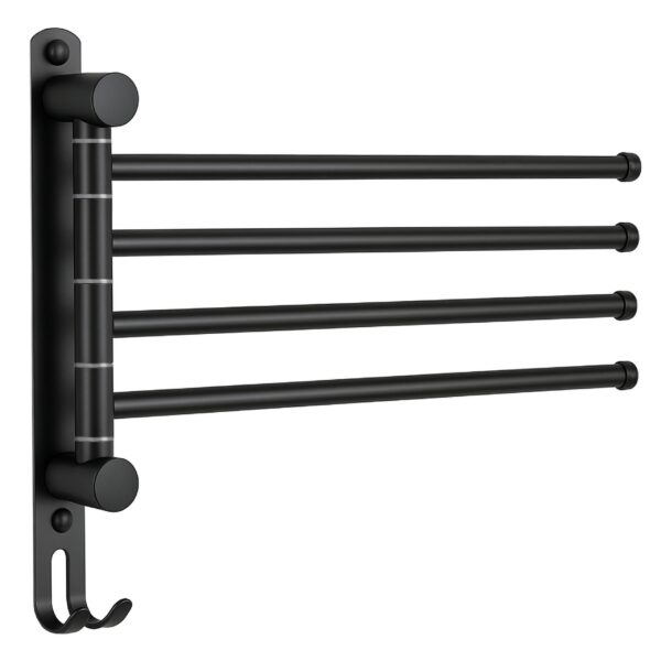 Czarny wieszak łazienkowy Cetri ma 4 ruchome ramiona, dzięki czemu można na nim rozwiesić 4 ręczniki. Wieszak został wykonany z trwałej, malowanej proszkowo stali – elegancki i odporny.