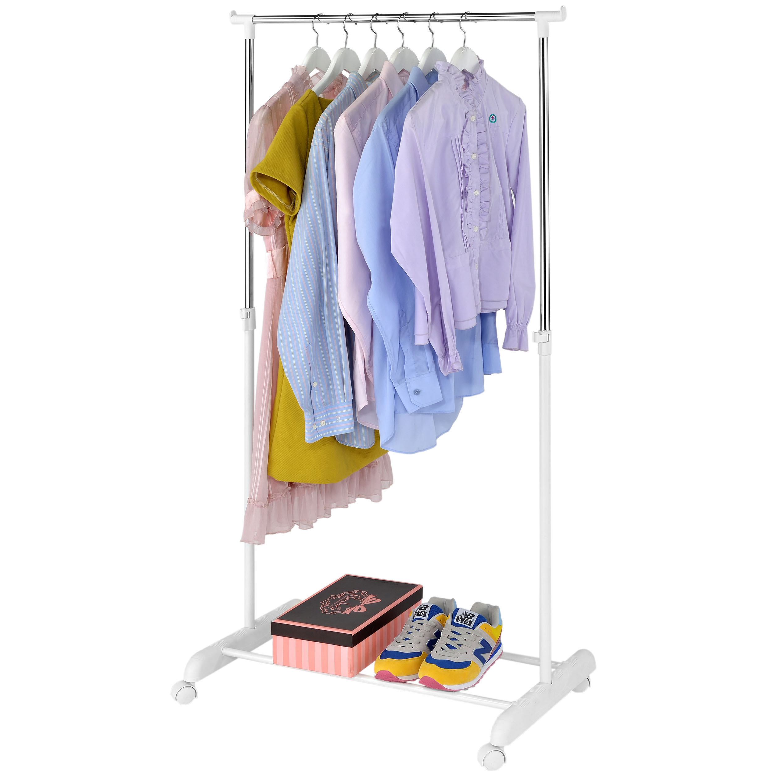 Uniwersalna, mobilna garderoba na kółkach. Lekka, praktyczna, rozkładana na wielu płaszczyznach. Pozwala zawiesić ogromną ilosć wieszaków i zaprowadzić porządek w garderobie. Nieodłączny element każdego butiku czy domowej garderoby. Często używana także w stiudiu fotograficznym i projektowym. Posiada regulowaną wysokość, kółka ułatwiające przemieszczanie wieszaka i dodatkowe zabezpieczenia na końcach wieszaka, zapobiegające zsuwaniu się odzieży.