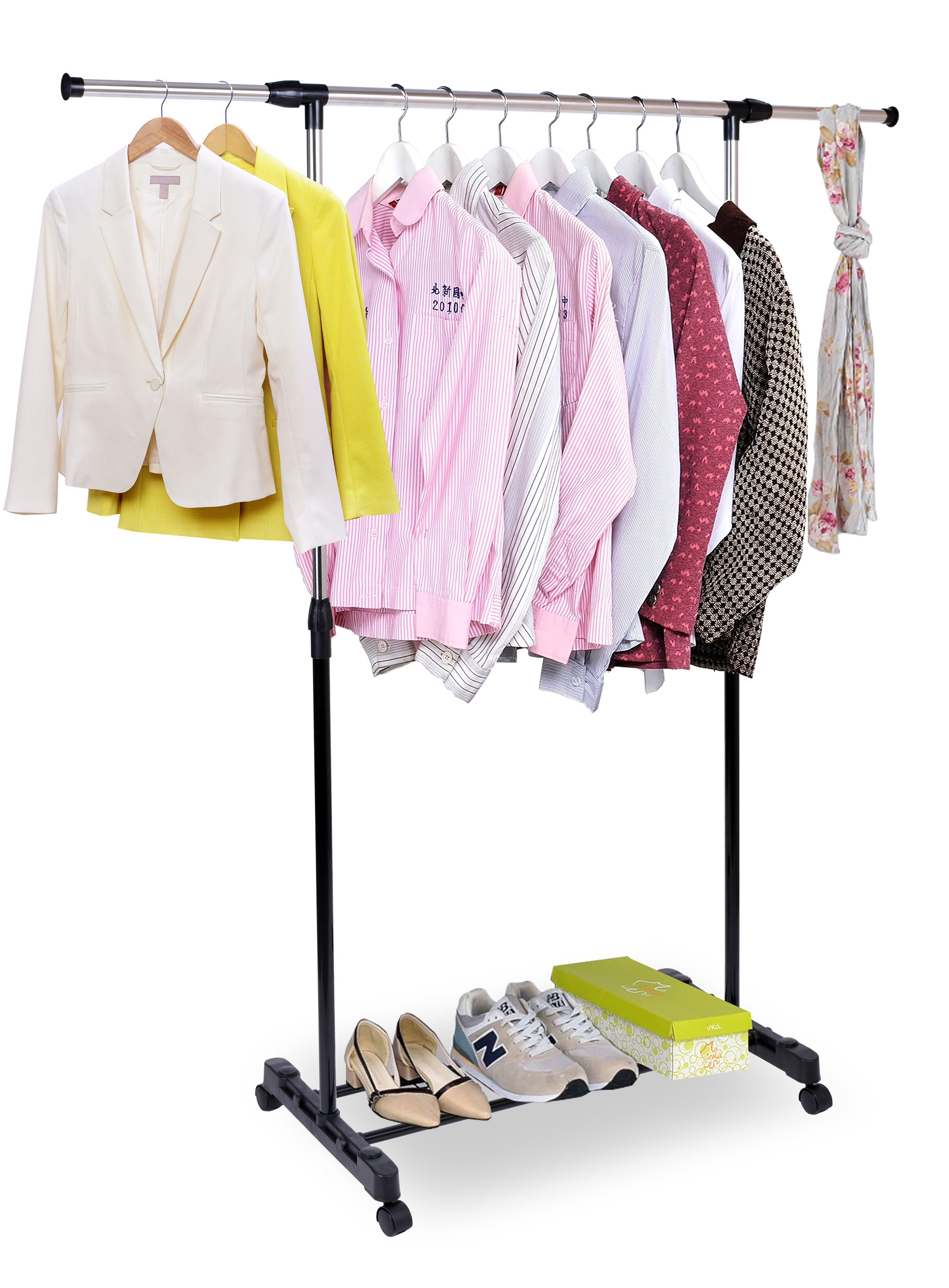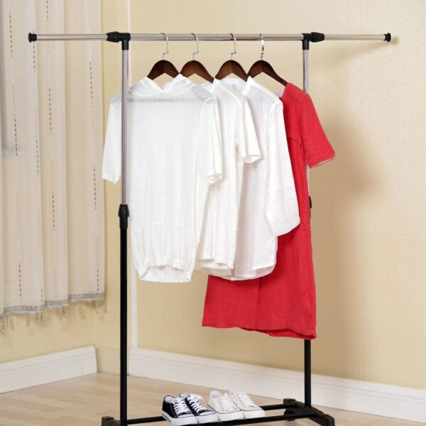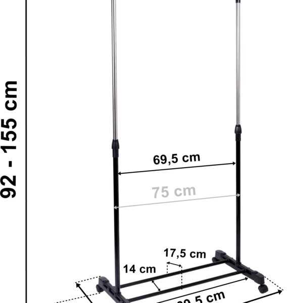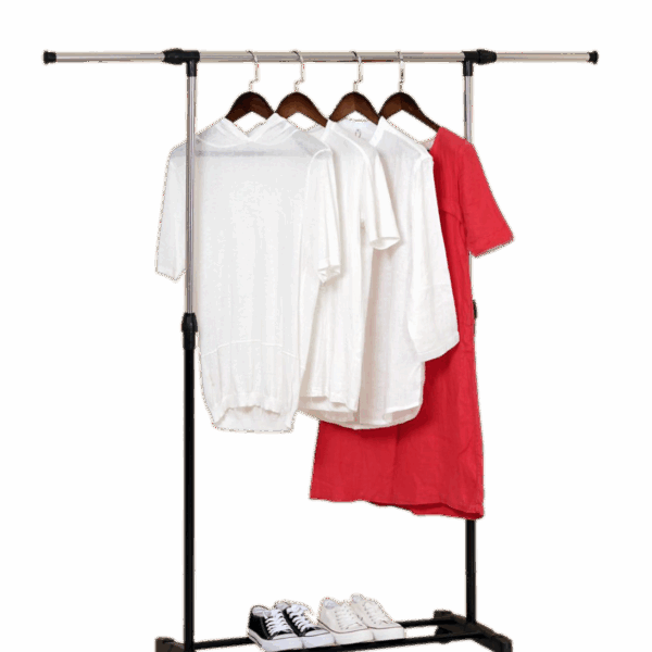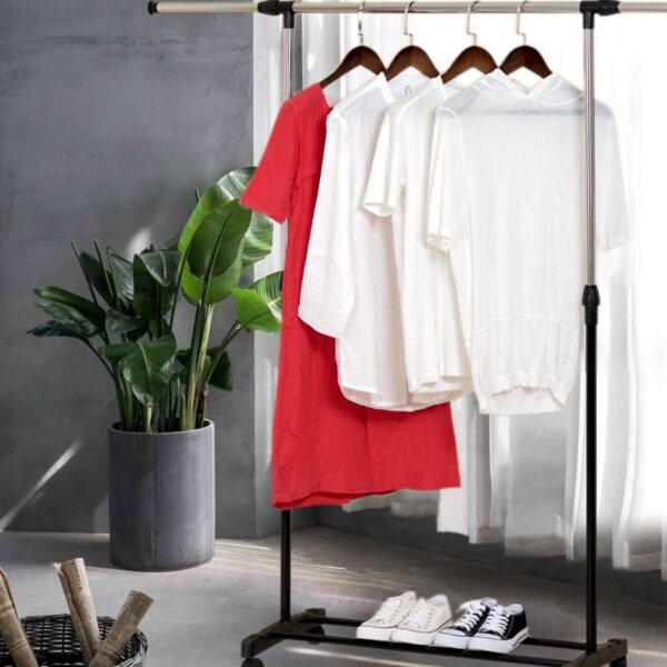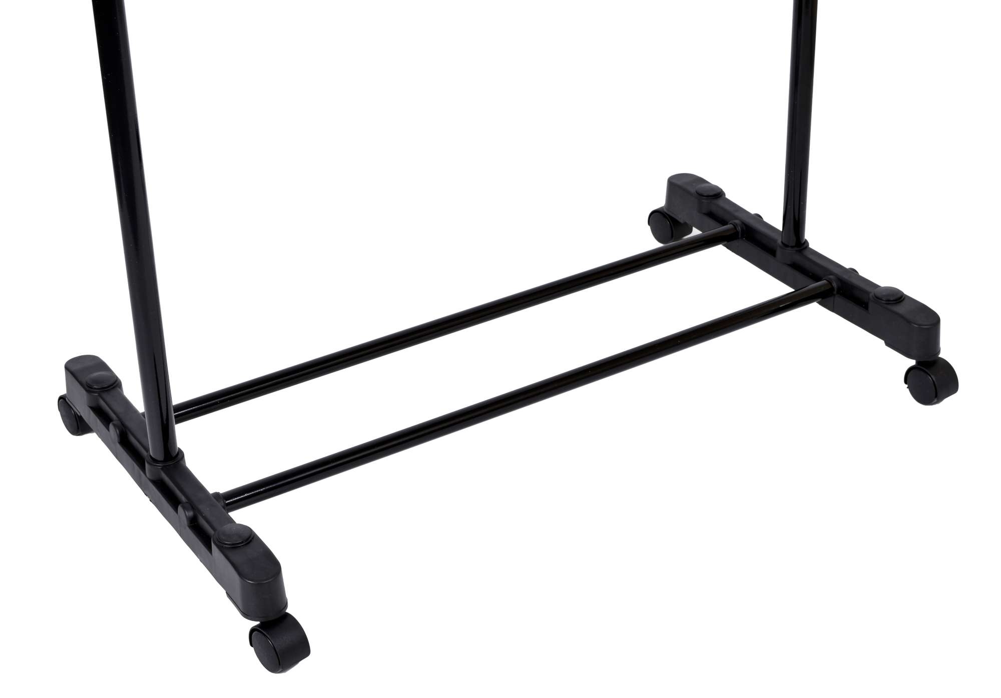Praktyczny i wytrzymały wieszak garderobiany na kółkach. Wieszak sprawdzi się w każdym domu i w biurze, w którym brakuje miejsca do powieszenia odzieży. Nasz produkt został wyposażony w pojedynczy chromowany drążek, który pomieści dużo odzieży. Dodatkowym atutem wieszaka jest wytrzymała i zaskakująco pojemna półka na buty, oraz nakładki na końce drążka uniemożliwiające zsunięcie się odzieży. Montaż wieszaka jest niezwykle prosty i nie wymaga użycia narzędzi.