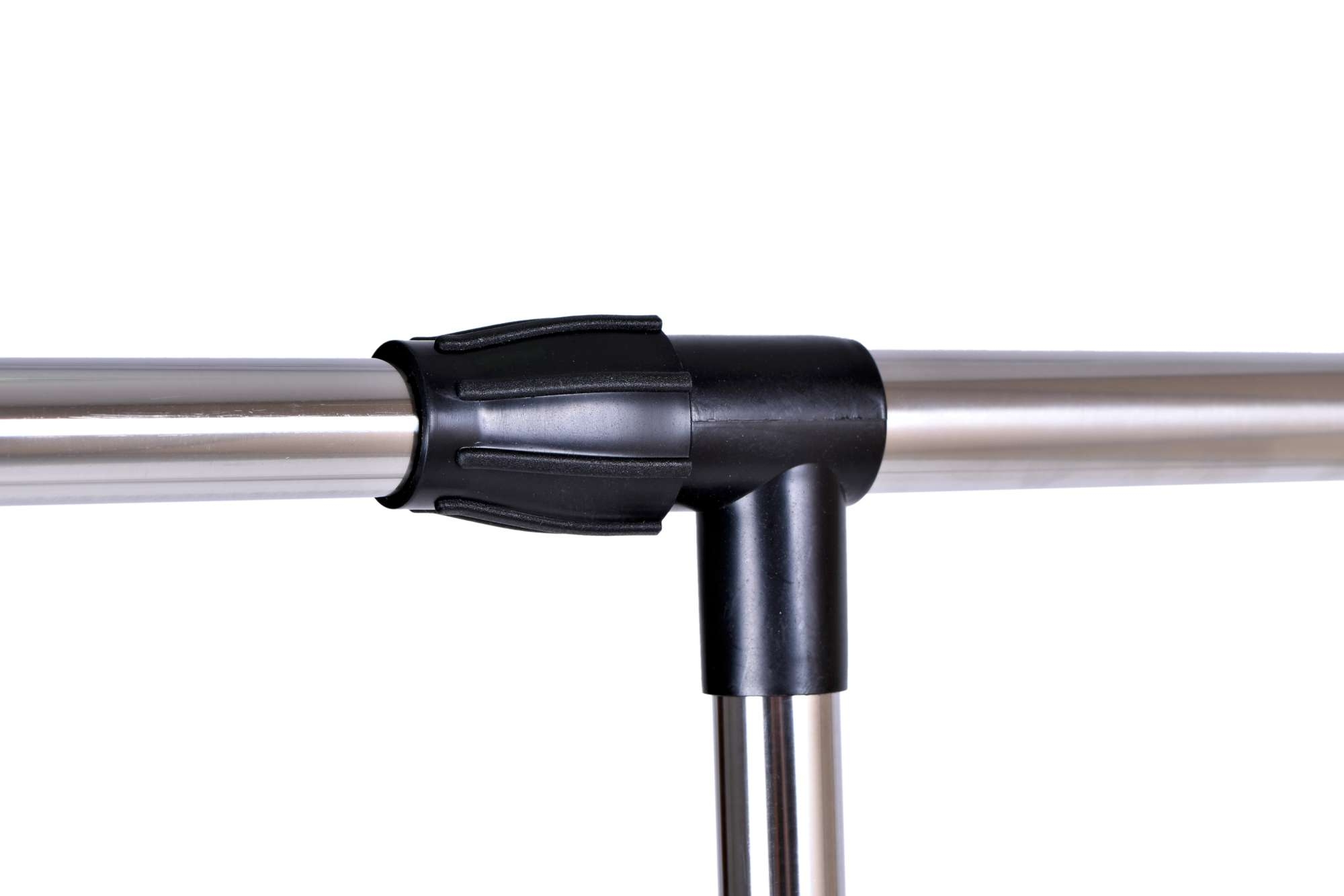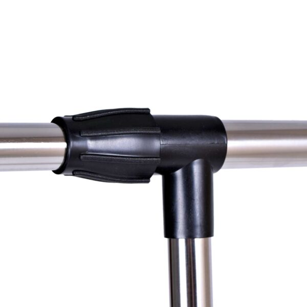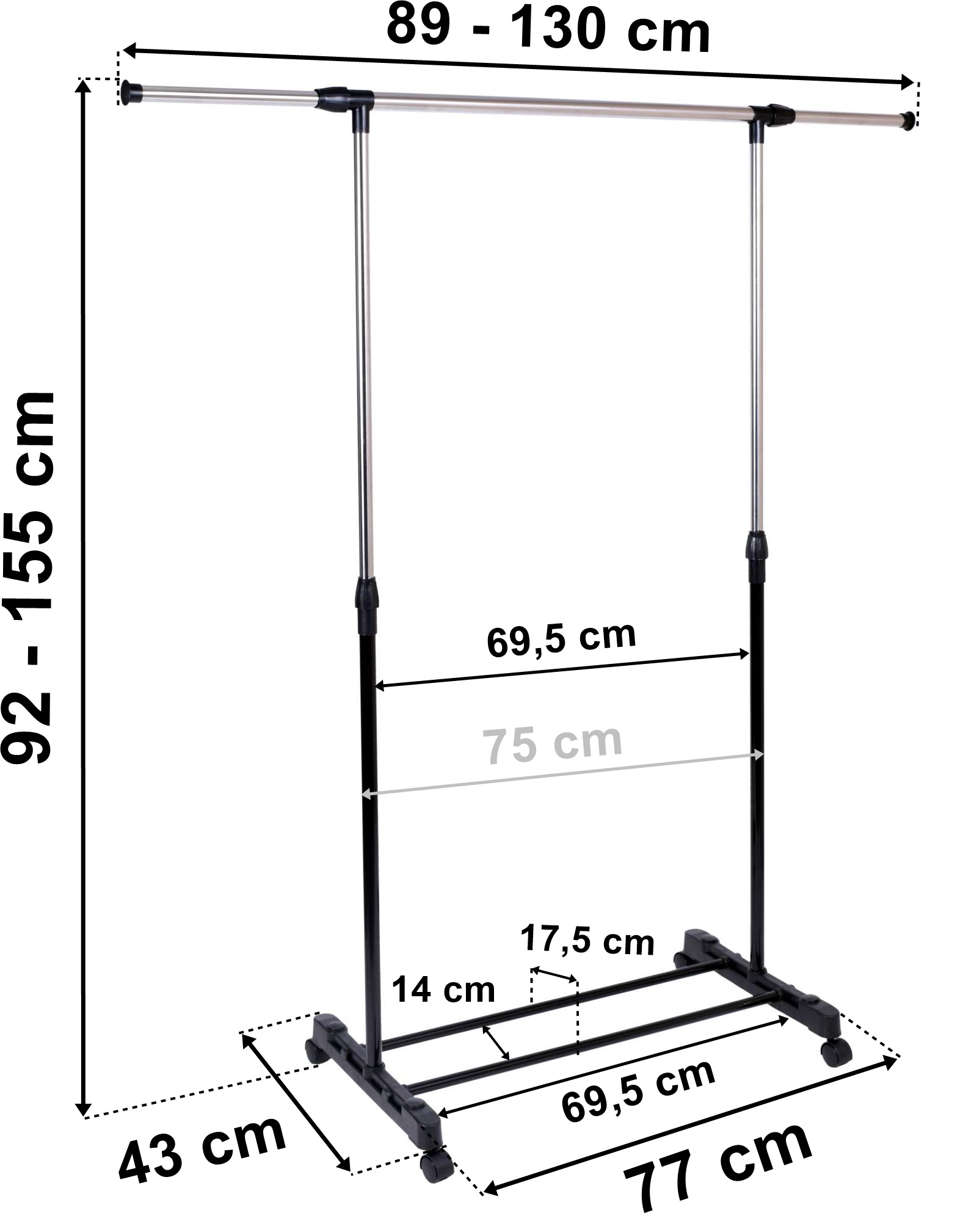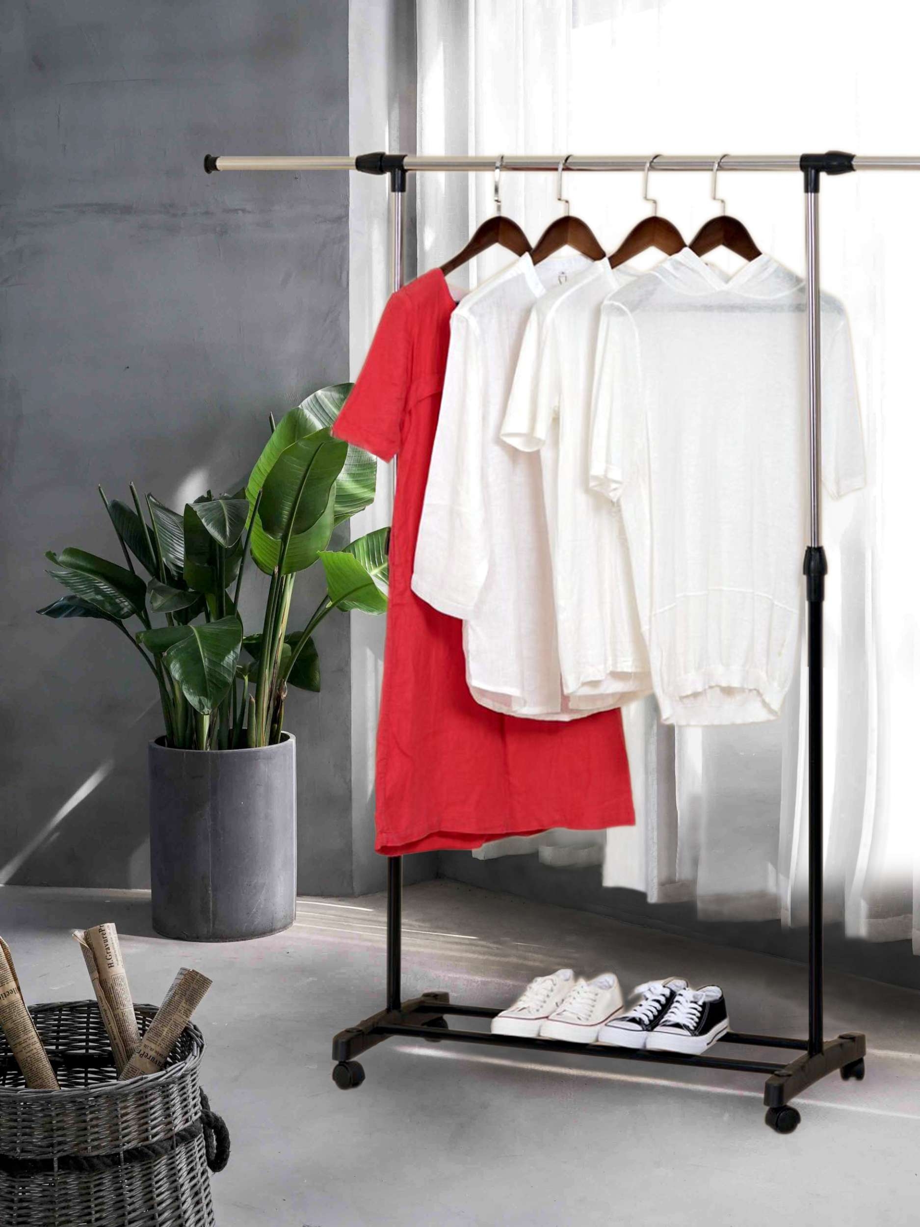 Praktyczny i wytrzymały wieszak garderobiany na kółkach. Wieszak sprawdzi się w każdym domu i w biurze, w którym brakuje miejsca do powieszenia odzieży. Nasz produkt został wyposażony w pojedynczy chromowany drążek, który pomieści dużo odzieży. Dodatkowym atutem wieszaka jest wytrzymała i zaskakująco pojemna półka na buty, oraz nakładki na końce drążka uniemożliwiające zsunięcie się odzieży. Montaż wieszaka jest niezwykle prosty i nie wymaga użycia narzędzi.