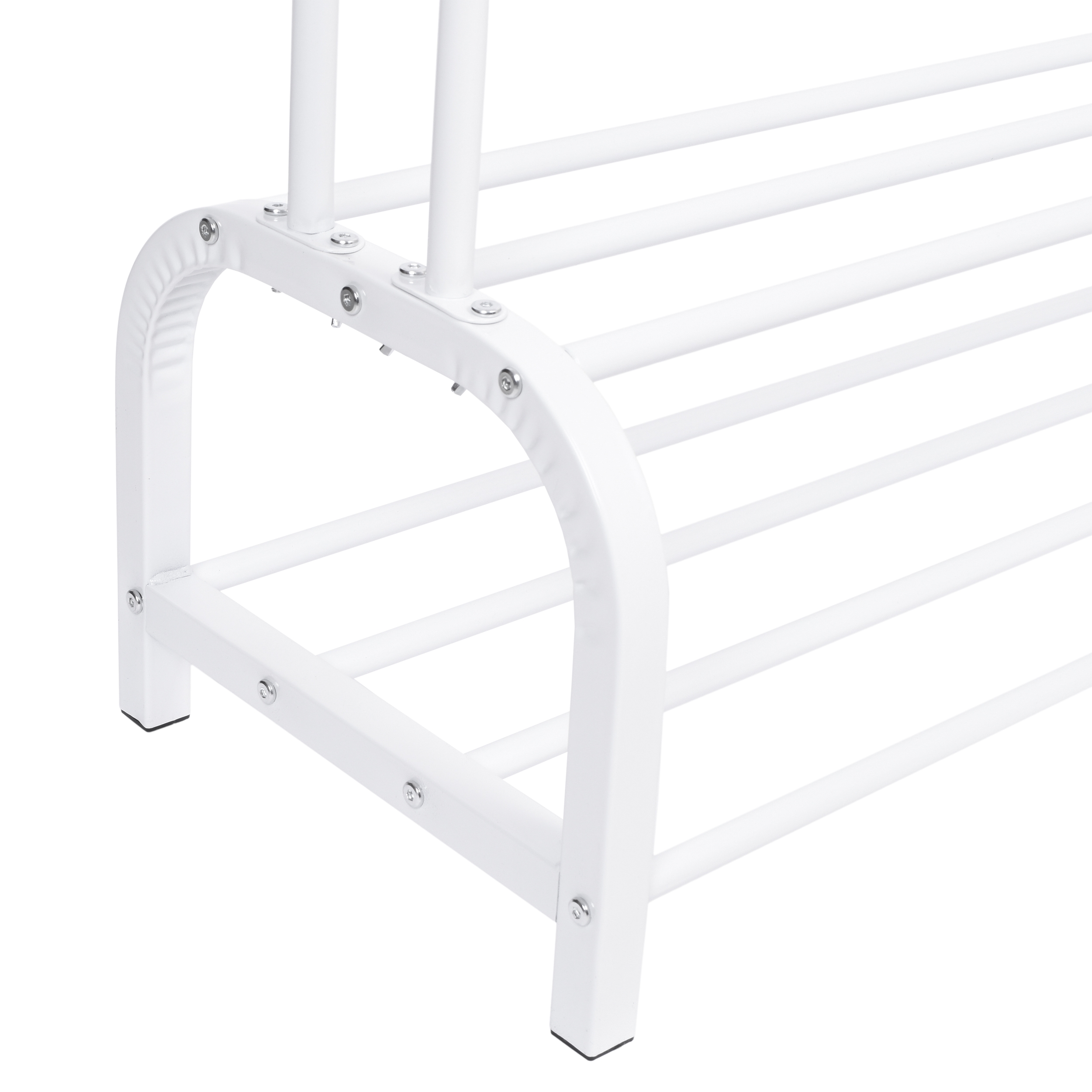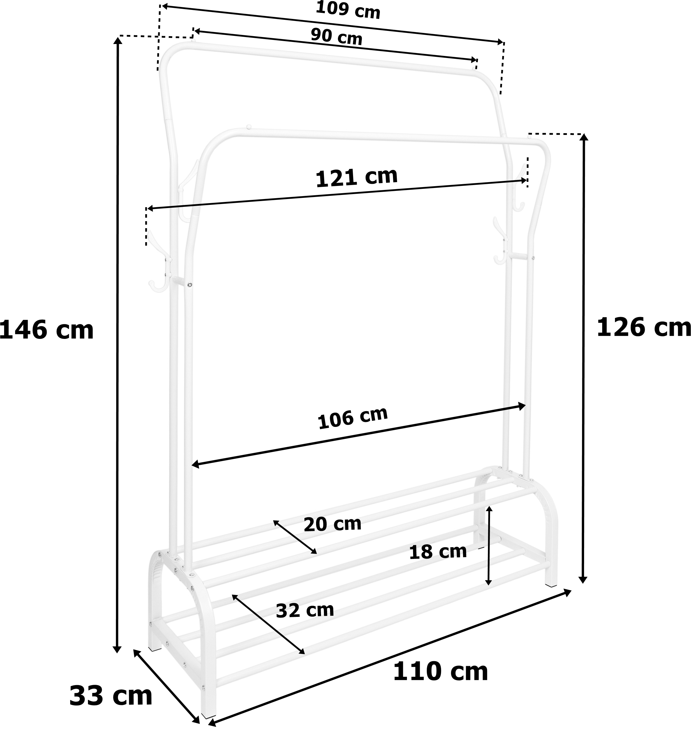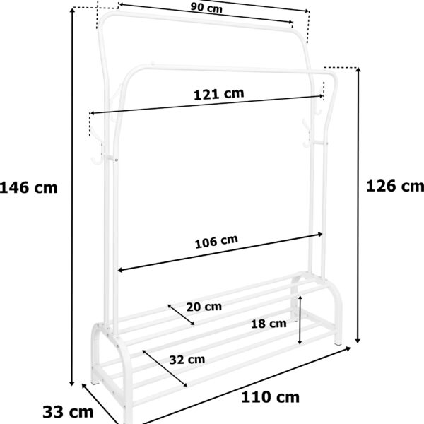 Wieszak garderobiany Lary to idealne rozwiązanie dla osób, które potrzebują dużo miejsca na przechowywanie swoich ubrań i akcesoriów. Ten podwójny wieszak garderobiany wyposażony jest w dodatkowe haczyki na akcesoria oraz dolne półki, które pozwalają na przechowywanie butów i innych przedmiotów. Konstrukcja wieszaka wykonana jest z solidnych stalowych rurek, które zostały malowane proszkowo na biały kolor, zapewniając mu stabilność i wytrzymałość. Dodatkowo, dwie poziome główne rurki posiadają blokady przed zsuwaniem się ubrań, co zapobiega nieporządkowi i zapewnia ładny wygląd garderoby. Wieszak Lary to model wielofunkcyjny i praktyczny, wykonany z materiałów najwyższej jakości, dbając o każdy szczegół. Dzięki niemu można pomieścić wiele ubrań i akcesoriów, jednocześnie oszczędzając cenną przestrzeń w garderobie.