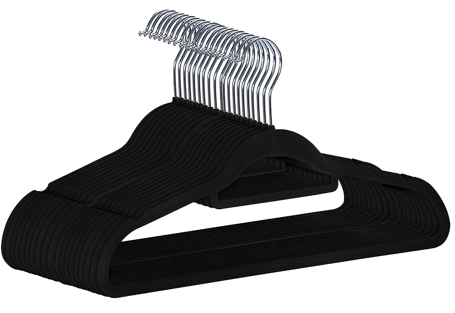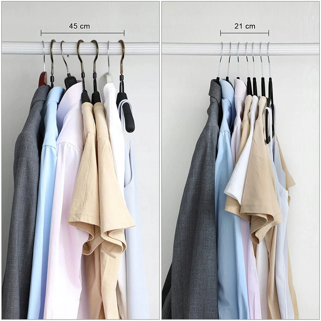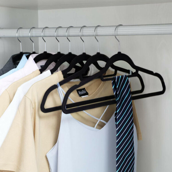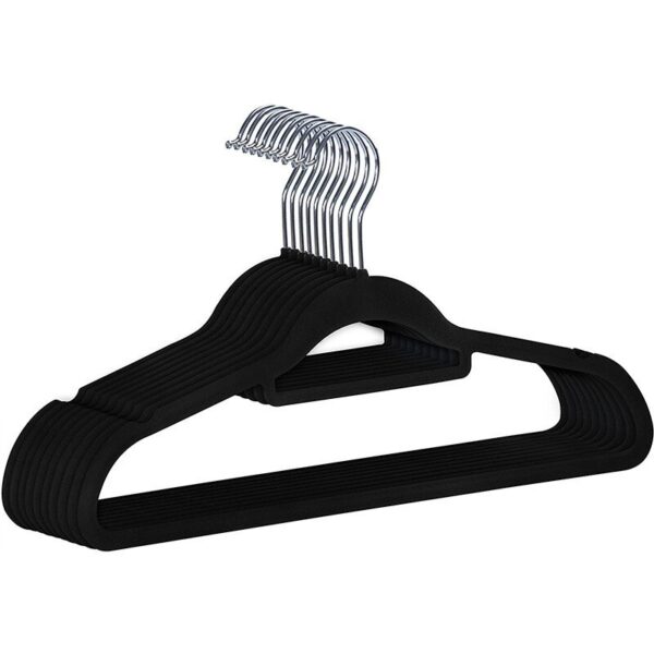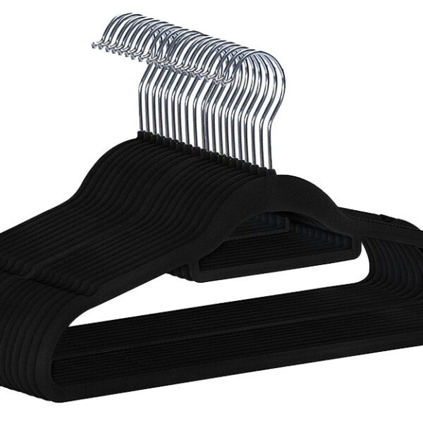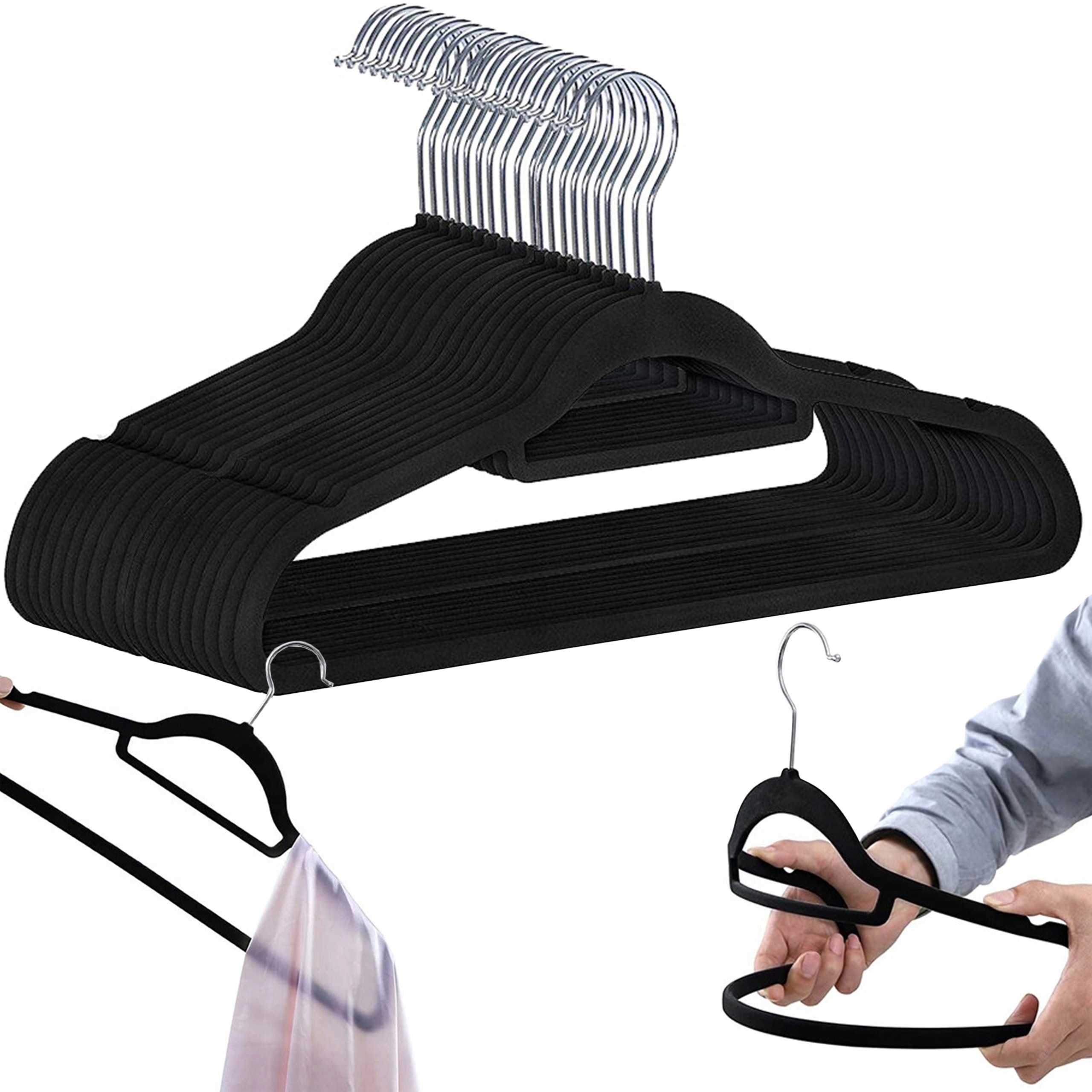 Wieszaki metalowe pokryte miłym w dotyku welurem. Powierzchnia antypoślizgowa zapobiega zsuwaniu się ubrań. Metalowe wnętrze gwarantuje duży udźwig wieszaków- do pięciu kilogramów każdy. Wieszak posiada dwie poprzeczki, mniejsza na dodatki, większa na spodnie. Ramiona z dodatkowymi wcięciami na topy i sukienki o drobnych ramiączkach. Obrotowy hak pozwala zawiesić je wygodnie niemal wszędzie.