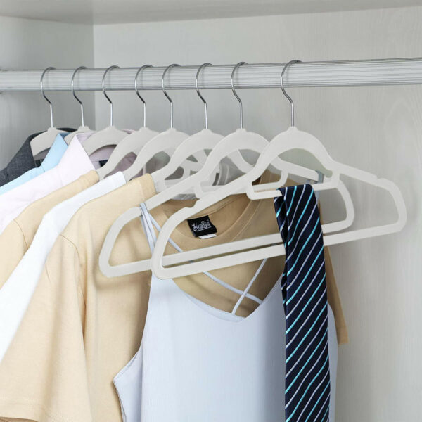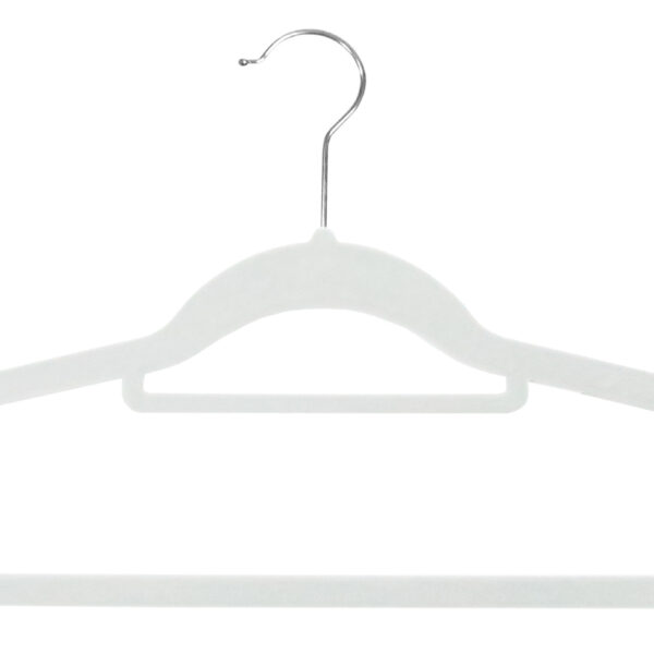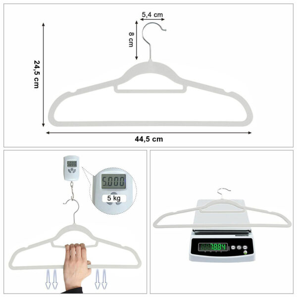 Wieszaki metalowe pokryte miłym w dotyku welurem. Powierzchnia antypoślizgowa zapobiega zsuwaniu się ubrań. Metalowe wnętrze gwarantuje duży udźwig wieszaków- do pięciu kilogramów każdy. Wieszak posiada dwie poprzeczki, mniejsza na dodatki, większa na spodnie. Ramiona z dodatkowymi wcięciami na topy i sukienki o drobnych ramiączkach. Obrotowy hak pozwala zawiesić je wygodnie niemal wszędzie.