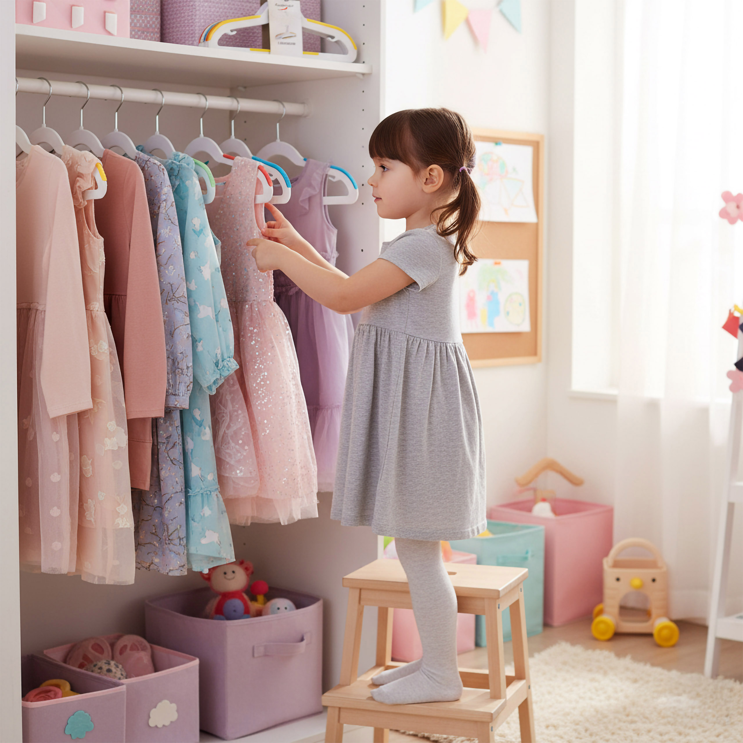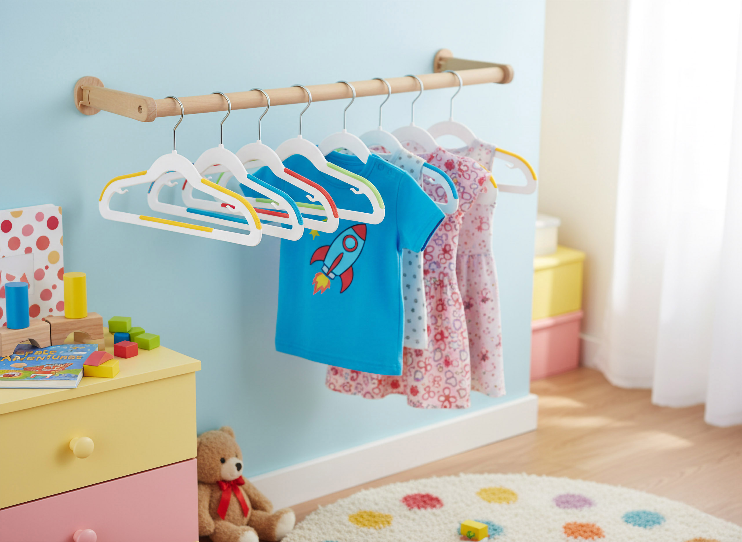 Wieszaki Kidsi to idealne połączenie funkcjonalności i zabawy! Dzięki nim ubranka Twojego dziecka zawsze będą schludnie powieszone – bez zagnieceń i zsuwania się z drążka. Zestaw 30 wieszaków w żywych, radosnych kolorach nie tylko ożywi wnętrze szafy, ale także zachęci malucha do samodzielnego dbania o porządek. Każdy wieszak został wykonany z solidnych, bezpiecznych materiałów i wyposażony w antypoślizgową powierzchnię, która zapewnia trwałość oraz wygodę użytkowania. To praktyczne rozwiązanie, które ułatwia codzienne ubieranie i uczy dziecko organizacji w przyjemny sposób.