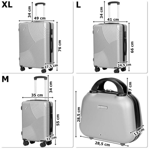 Zestaw składa się z dużej, średniej i małej walizki oraz kufra, idealnie dostosowanego do różnych potrzeb podróżnych.