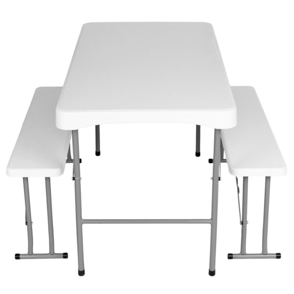 Konstrukcja wykonana ze stali. Blat stołu oraz siedziska ławek wykonany z mocnego tworzywa sztucznego. Zajmuje małą przestrzeń i jest łatwy do przeniesienia.