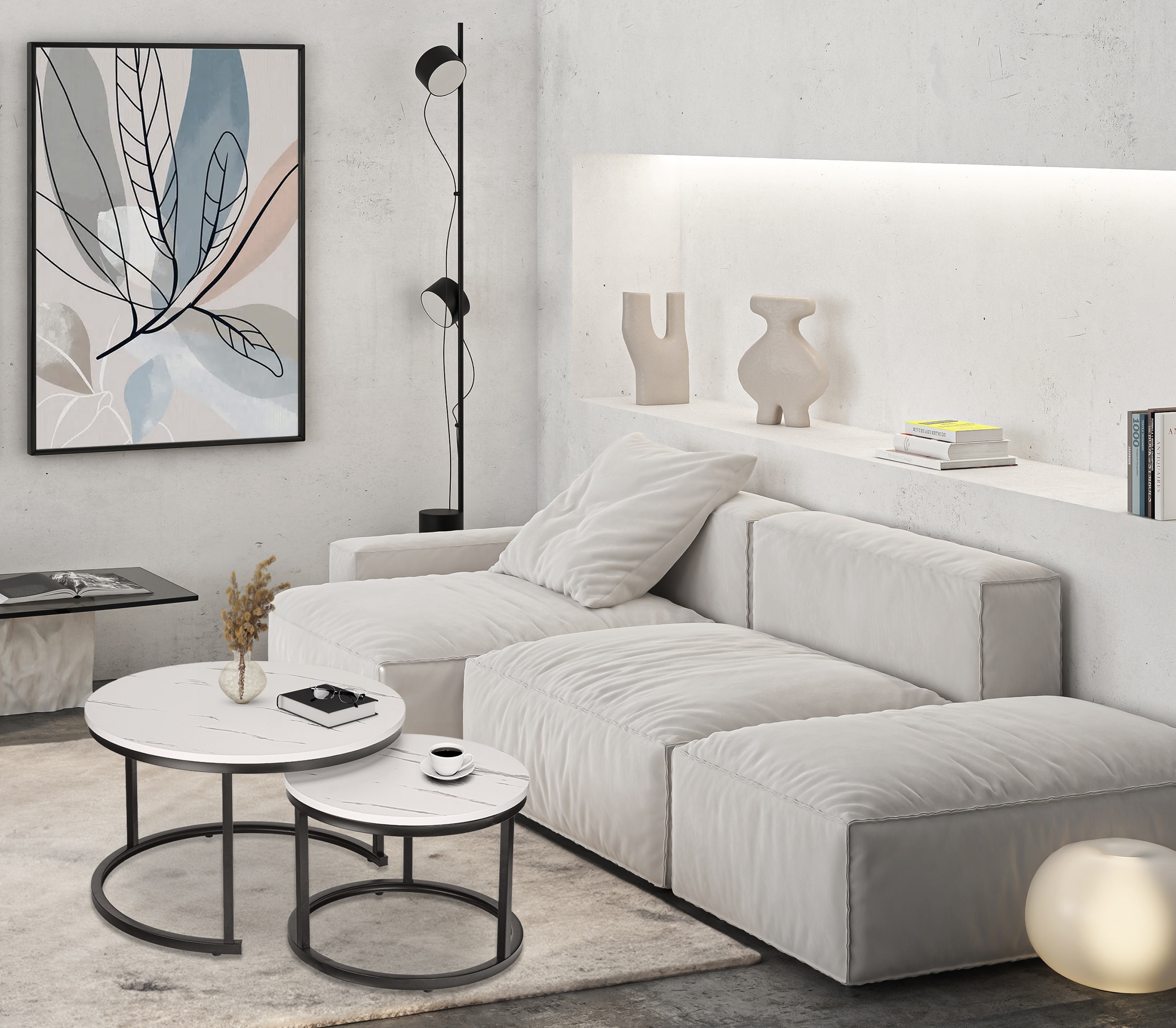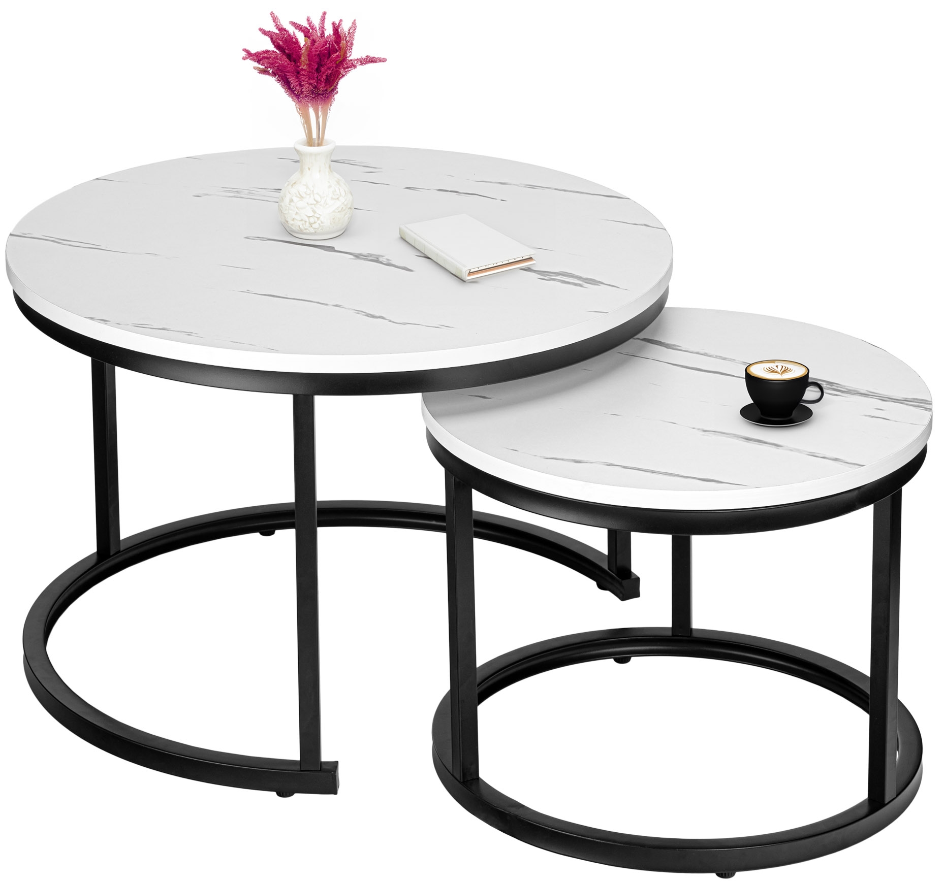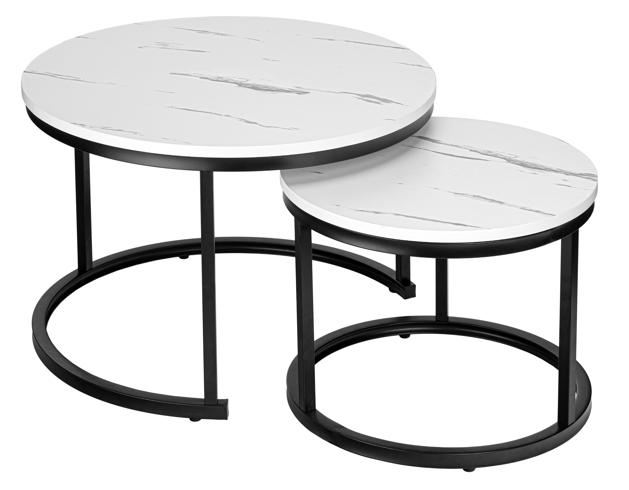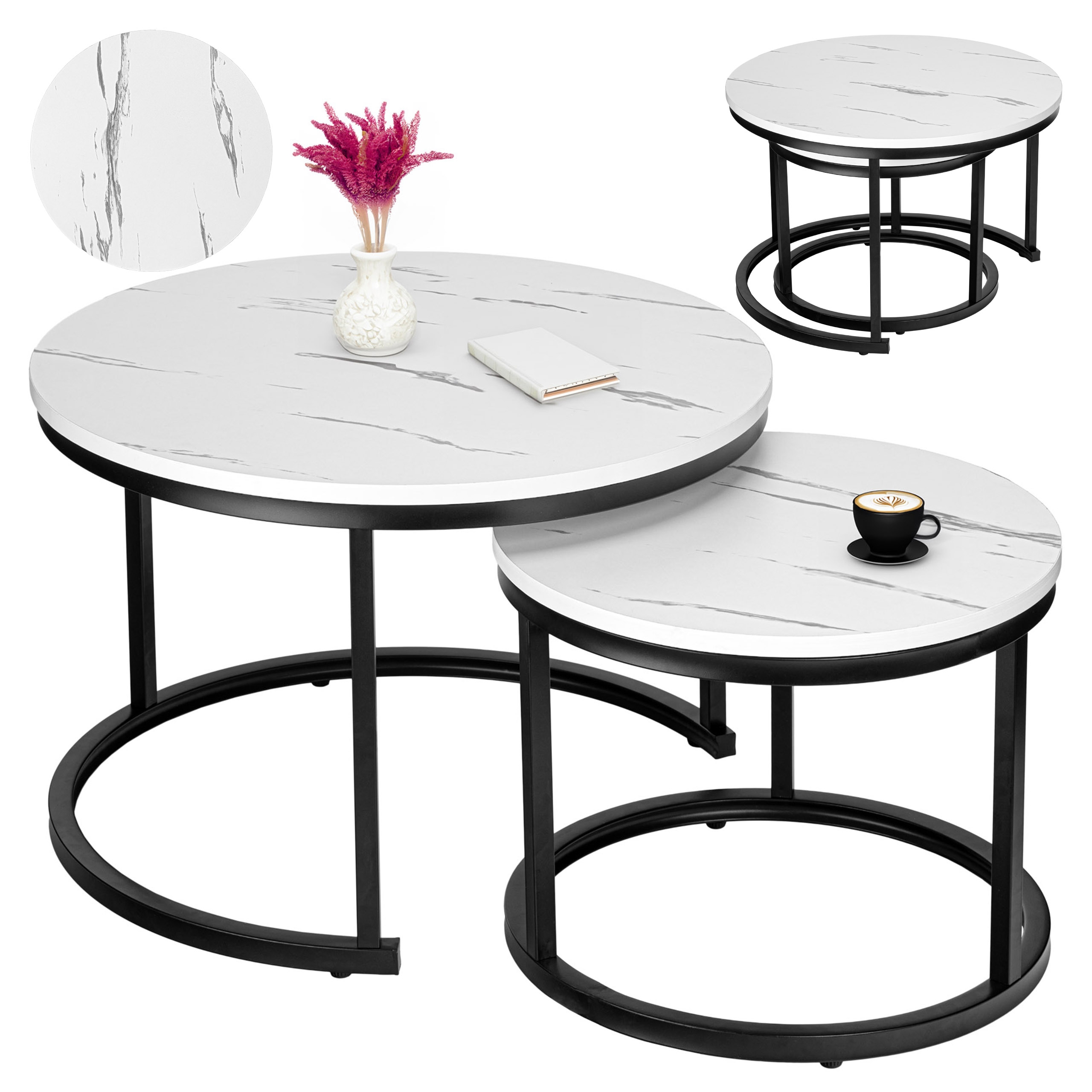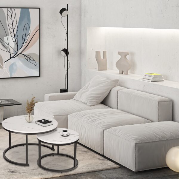Zestaw stolików Galen Biały Marmur to połączenie nowoczesnego designu i wyjątkowej funkcjonalności, które idealnie wpasuje się w każde wnętrze. Dzięki kompaktowej konstrukcji i możliwości wsunięcia mniejszego stolika pod większy możesz zaoszczędzić przestrzeń, a jednocześnie cieszyć się eleganckim dodatkiem do swojego salonu. Możesz używać ich razem lub osobno, tworząc unikalne kompozycje. Zestaw stolików wykonany jest z solidnej metalowej konstrukcji, a maksymalne obciążenie jednego stolika to aż 75 kg. Galen to zestaw, który łączy estetykę z wygodą użytkowania – doskonały wybór dla wymagających!